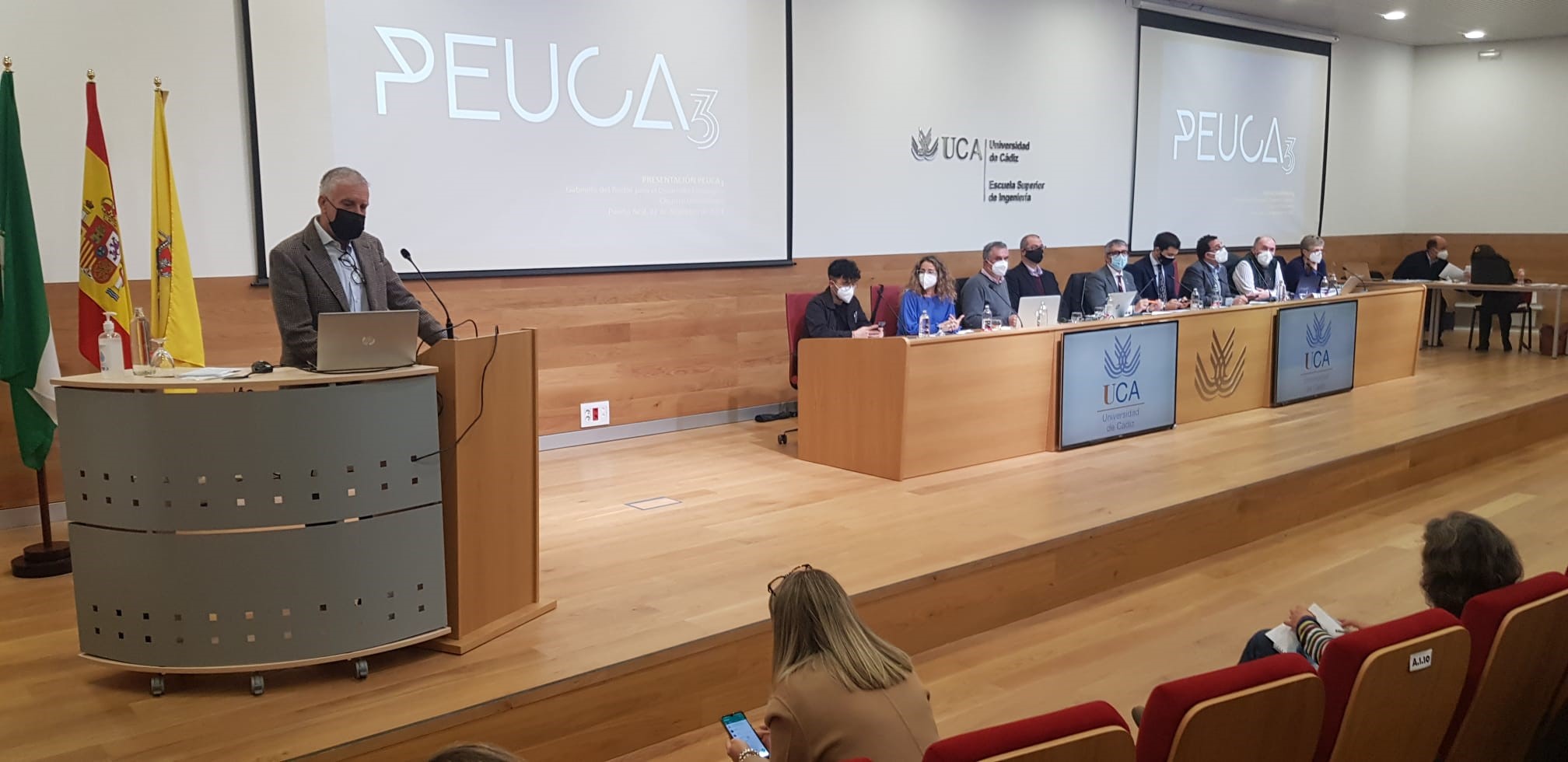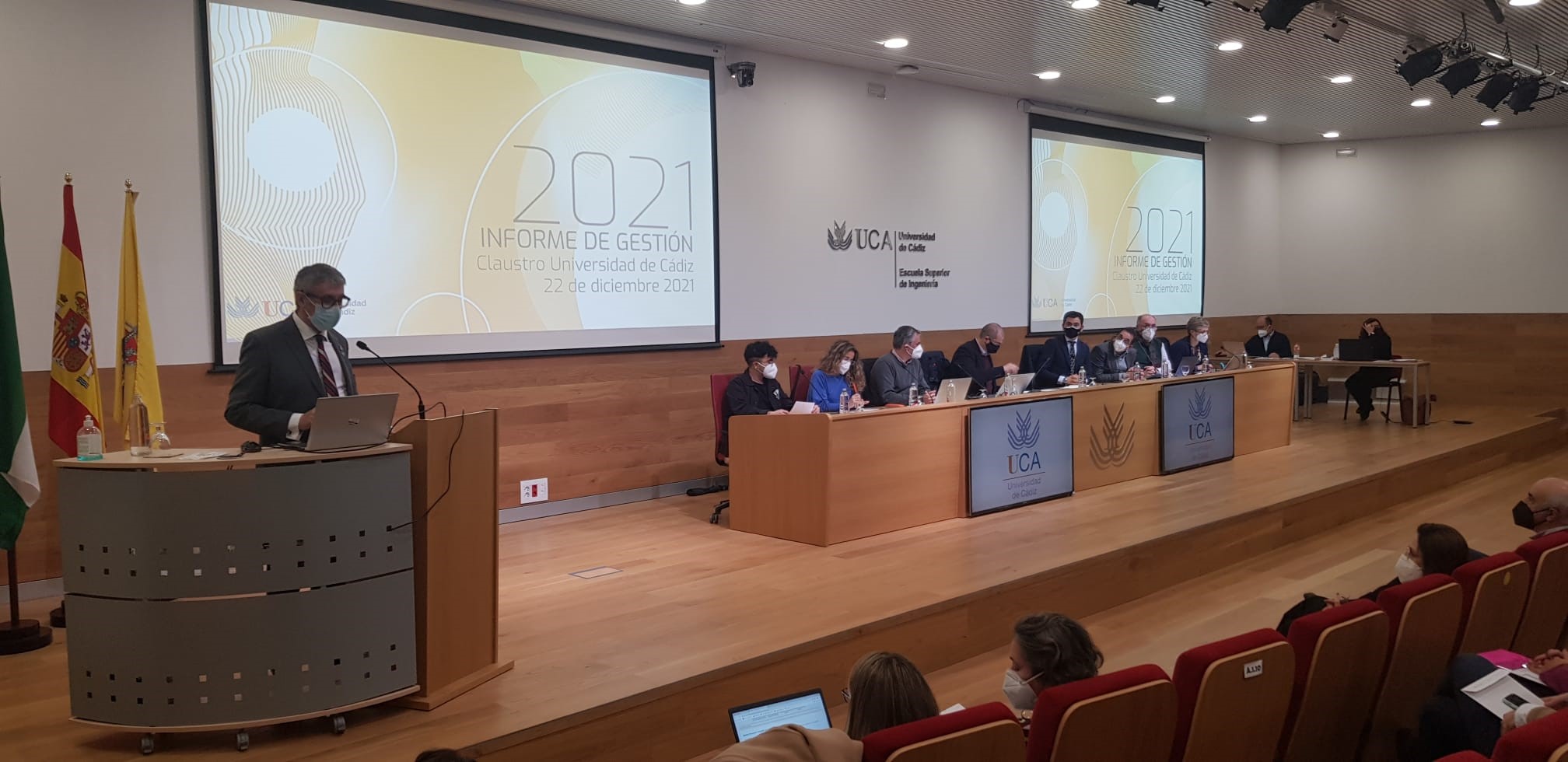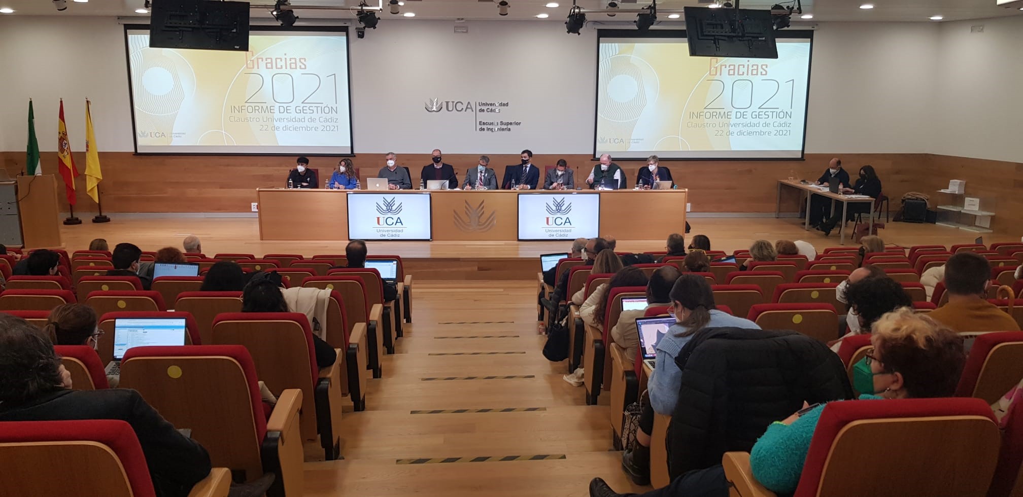 La Universidad de Cádiz ha celebrado hoy el Claustro ordinario de diciembre donde, entre otros asuntos, ha sido aprobado el Informe de Gestión del Rector de 2021 (con 114 votos favorables, 3 contra y 9 en blanco) y el documento del tercer Plan Estratégico de la UCA (PEUCA3), que ha sido objeto de trabajo y debate por parte de la comunidad universitaria a lo largo de los últimos meses. Igualmente, se han presentado las memorias de actividades de la Defensoría Universitaria y de la Inspección General de Servicios de la UCA correspondientes al curso 2020/21 y el informe de auditoría interna. Además, se ha procedido a la aprobación de la investidura de Almudena Grandes y Laura Lechuga como doctoras Honoris Causa de la UCA.