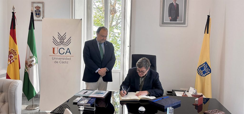 El rector de la Universidad de Cádiz, Casimiro Mantell, ha recibido en el Rectorado al director del Instituto Cervantes, Luis García Montero, con motivo de su participación en la Semana Universitaria del Libro 2025, que se celebra durante esta semana en los cuatro campus de la institución. Durante el encuentro, el poeta granadino ha firmado en el Libro de Honor de la UCA y ha repasado con el rector algunas de sus vivencias en la Universidad de Cádiz, a la que le unen lazos académicos y emocionales.