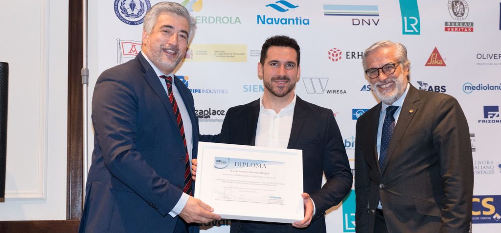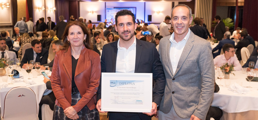 El presidente de AINE, Diego Fernández, y el director del Centro de Excelencia del Sector Naval de Siemens Digital Industries Sotfware, Javier Fernández, le hicieron entrega del premio, diploma acreditativo y dotación económica de 1.000 euros, durante la celebración del 62º Congreso de Ingeniería Naval e Industria Marítima en Bilbao.