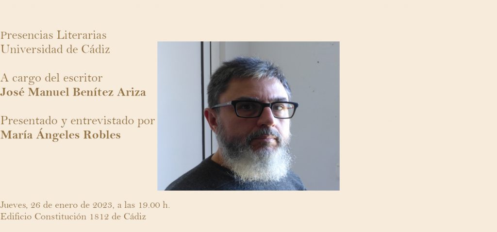 El programa Presencias Literarias, impulsado por el servicio de Extensión Universitaria del Vicerrectorado de Cultura de la Universidad de Cádiz, traerá el próximo jueves 26, a las 19:00 horas y en el edificio Constitución 1812 de Cádiz, al escritor, profesor doctor de la UCA, José Manuel Benítez Ariza, quien dialogará con la periodista Mª Ángeles Robles. La entrada será libre hasta completar aforo.