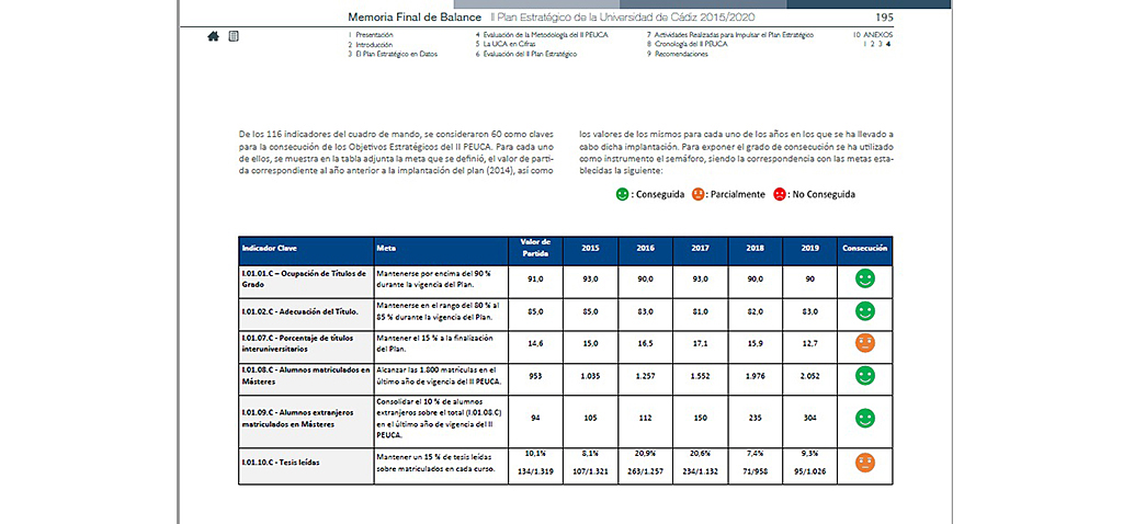 Asimismo, entre sus apartados destaca el ANEXO IV que muestra la evolución de los 116 indicadores del II PEUCA, así como la monitorización de las metas previstas para cada uno de los 60 indicadores claves.