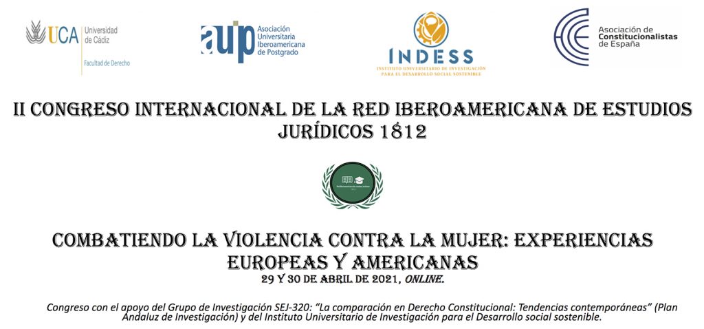 La Red Iberoamericana de Estudios Jurídicos 1812, con la colaboración del grupo de investigación SEJ-320 del Plan Andaluz de Investigación, del Instituto Universitario de Investigación para el Desarrollo Social Sostenible de la UCA y la Asociación Universitaria Iberoamericana de Posgrado (AUIP), organiza los próximos días 29 y 30 de abril el II Congreso Internacional Combatiendo la violencia contra la mujer: Experiencias europeas y americanas. Este encuentro, en formato online, ha sido avalado por la Asociación de Constitucionalistas de España. La matrícula es gratuita para los estudiantes universitarios. El plazo para realizar inscripciones estará abierto hasta el día 23 de abril en: https://forms.gle/6xZmtCvry7ZvgUW7A