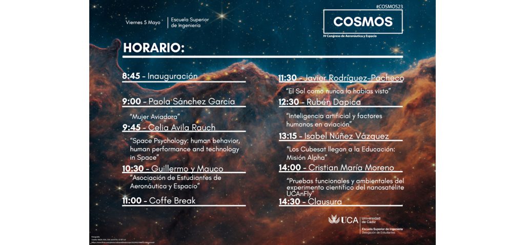 La Delegación de Estudiantes de la Escuela Superior de Ingeniería de la Universidad de Cádiz celebra el próximo viernes 5 de mayo el IV evento COSMOS de Ingeniería Aeronáutica y Espacio en Cádiz con la participación de centenares de estudiantes procedentes de diferentes puntos del ámbito español. El encuentro tiene como objetivo principal impulsar el interés y ampliar el conocimiento sobre el sector aeronáutico y del espacio. Con un carácter divulgativo, abarcará temas relacionados con la ingeniería Aeroespacial a través de distintas ponencias. La asistencia es totalmente gratuita y está abierta para toda la comunidad universitaria y no universitaria.