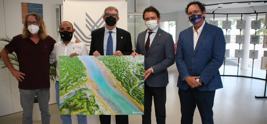 El delegado territorial de Desarrollo Sostenible de la Junta de Andalucía en Cádiz, Daniel Sánchez, junto al presidente de la Junta Rectora del Parque Natural Bahía de Cádiz, Javier Benavente, el director del Parque Natural Bahía de Cádiz, Rafael Martín, ha entregado al rector de la Universidad de Cádiz (UCA), Francisco Piniella, acompañado por el director General de Recursos Científicos de la UCA, Félix Ruiz, un cuadro con una fotografía del Parque Natural Bahía de Cádiz (imagen del Trocadero). Este obsequio se enmarca en una campaña de promoción de los espacios protegidos, impulsada por la Junta de Andalucía para visualizar los parques naturales y acercarlos a la ciudadanía.