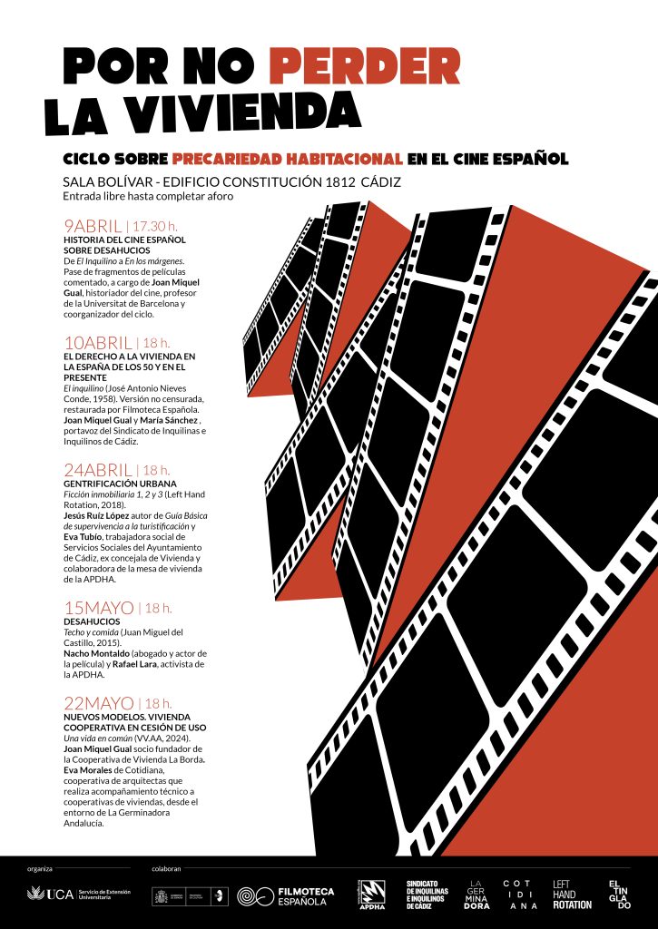 El 10 de abril se proyectará la versión restaurada y no censurada de El inquilino (1958), de José Antonio Nieves Conde. Tras la proyección tendrá lugar un coloquio con el propio Joan Miquel Gual y María Sánchez, portavoz del Sindicato de Inquilinas e Inquilinos de Cádiz, en el que se reflexionará sobre la situación del derecho a la vivienda en la España de los años cincuenta y su comparación con el contexto actual.