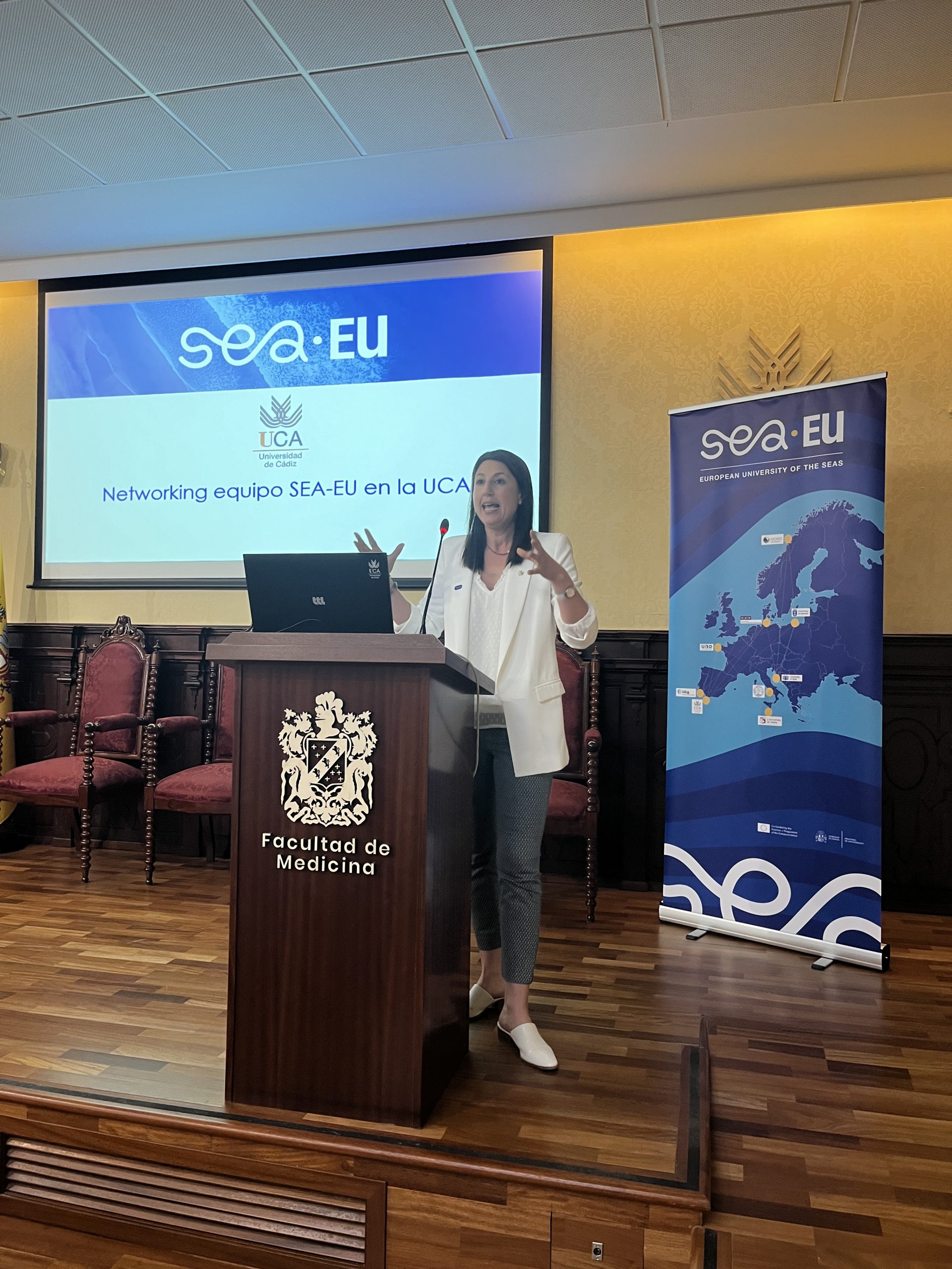 El salón de Grados de la Facultad de Medicina de la Universidad de Cádiz ha acogido el encuentro del equipo de la Universidad de Cádiz de la Universidad Europea de los Mares SEA-EU con una participación de alrededor de 60 personas que colaboran o han colaborado activamente en actividades de este proyecto europeo. Sus promotores pretendían fomentar el conocimiento mutuo entre los colaboradores, ponerles cara y explicar los avances y retos futuros de la Alianza.