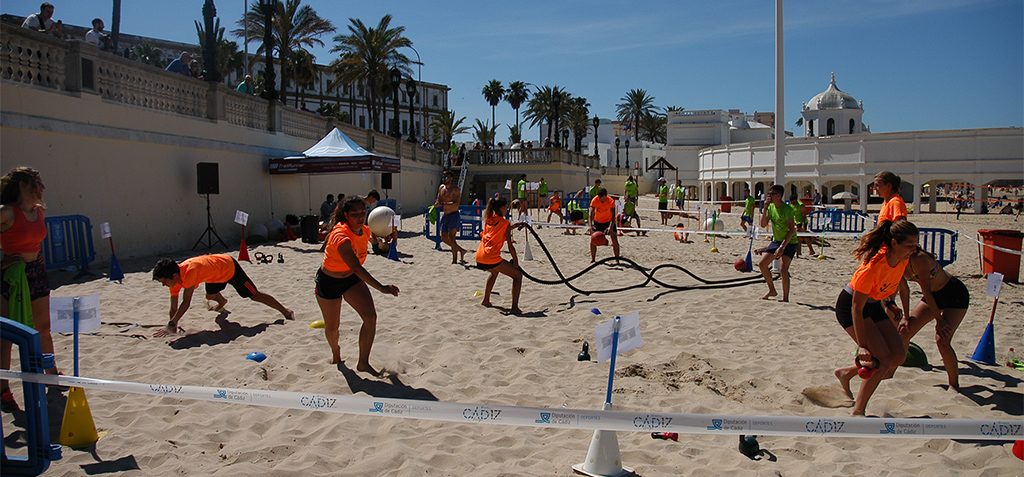Estudiantes de 4º del grado de Ciencias de la Actividad Física y el Deporte de la Universidad de Cádiz han organizado hoy la Jornada Naufit en la playa de La Caleta. Cerca de un centenar de alumnos y alumnas de la UCA han participado en esta actividad, abierta también a la ciudadanía.