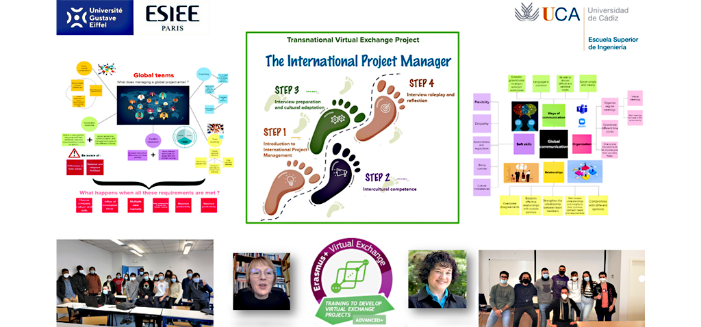 En el marco de la implementación de estrategias de Internacionalización en Casa, la Universidad de Cádiz en colaboración con la Universidad Gustave Eiffel (Francia) ha llevado a cabo el programa de intercambio virtual transnacional denominado The International Project Manager. Dicho programa, que tiene una duración de siete semanas, está orientado a fortalecer la formación de los futuras-os ingenieras-os en los aspectos específicamente relacionados con la dirección y gestión de proyectos internacionales.