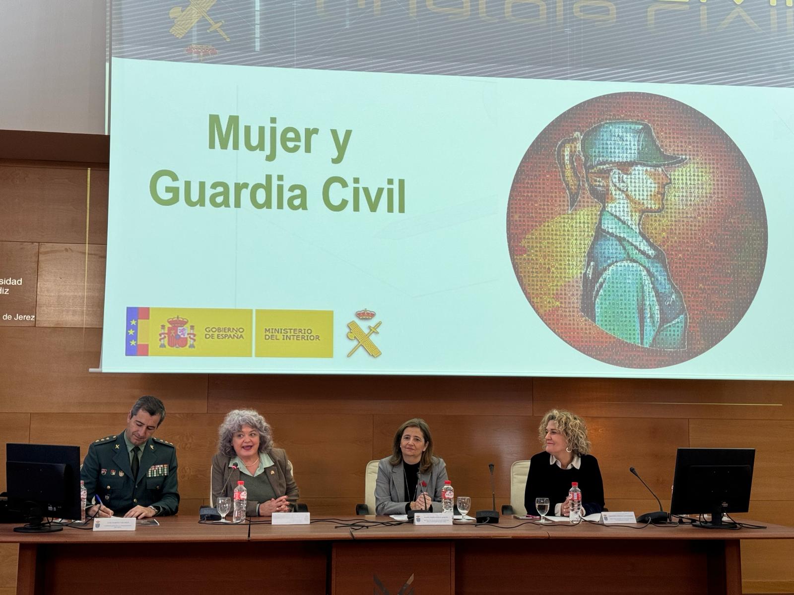 La Universidad de Cádiz ha celebrado hoy, con un aforo completo, las II Jornadas: Mujer y Guardia Civil en el Campus de Jerez. La decana de la Facultad de Derecho, Isabel Zurita, la subdelegada del Gobierno en Cádiz, Blanca Flores, la directora General de Igualdad de la UCA, Francisca Bernal, y el coronel Jefe de la Comandancia de Cádiz, Luis Martín, les han dado la bienvenida en el salón de Actos del edificio de Despachos y Seminarios.
