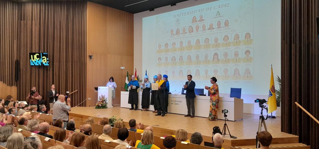 Una treintena de personas del Aula Universitaria de Mayores (AUM) de Algeciras se han graduado hoy en la Escuela Técnica Superior de Ingeniería de Algeciras. La vicerrectora de Estudiantes de la Universidad de Cádiz, Nuria Campos, en compañía de la vicerrectora del Campus Bahía de Algeciras, Mª Luz Martín, el subdelegado del Gobierno de la Junta de Andalucía, Francisco Javier Ros, la directora del Aula Universitaria de Mayores, M.ª Jesús Paredes, el subdirector del AUM en Algeciras, Carlos Camacho, y la presidenta de la asociación AUM Julia Traducta, Vitoria Guerrero, ha presidido hoy, en el salón de Actos, la ceremonia de graduación de 5º del AUM en Algeciras de la promoción 2019/2024.