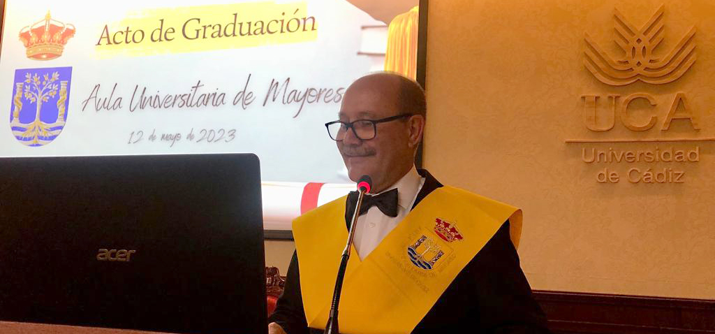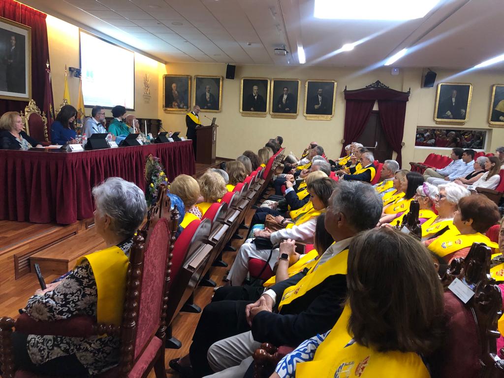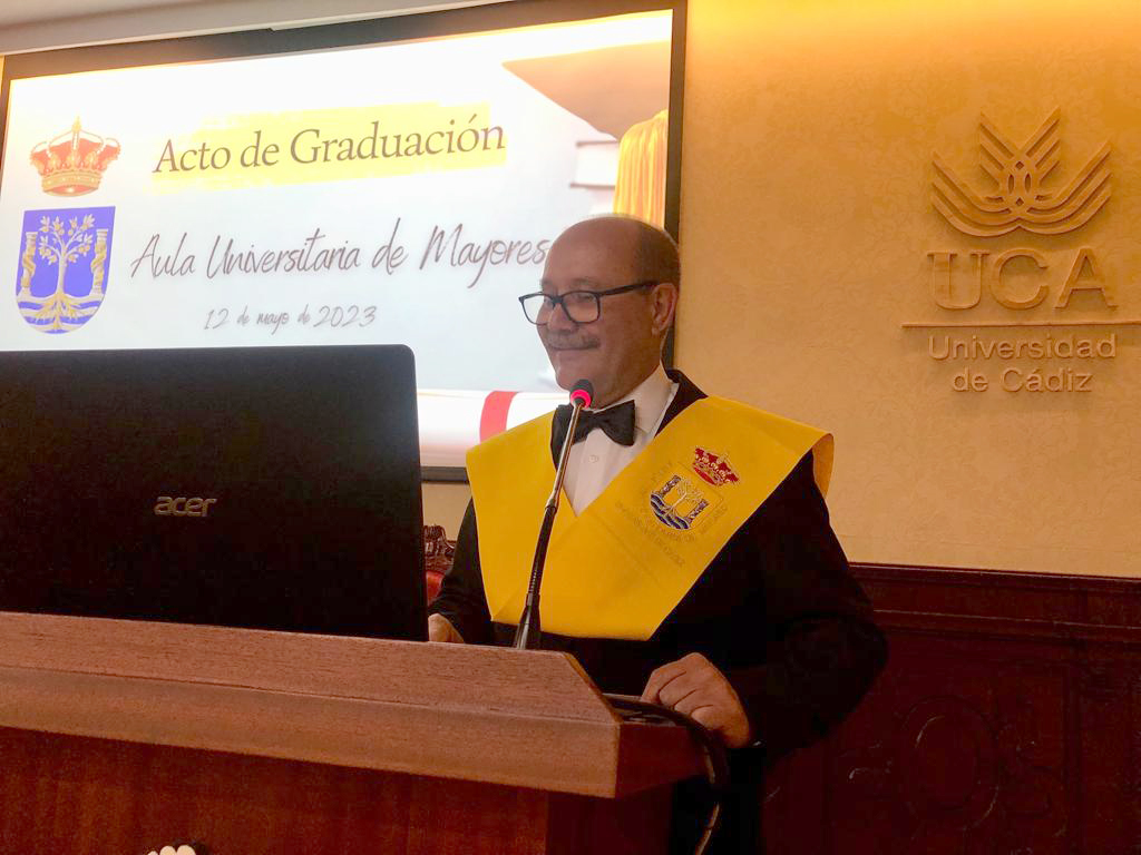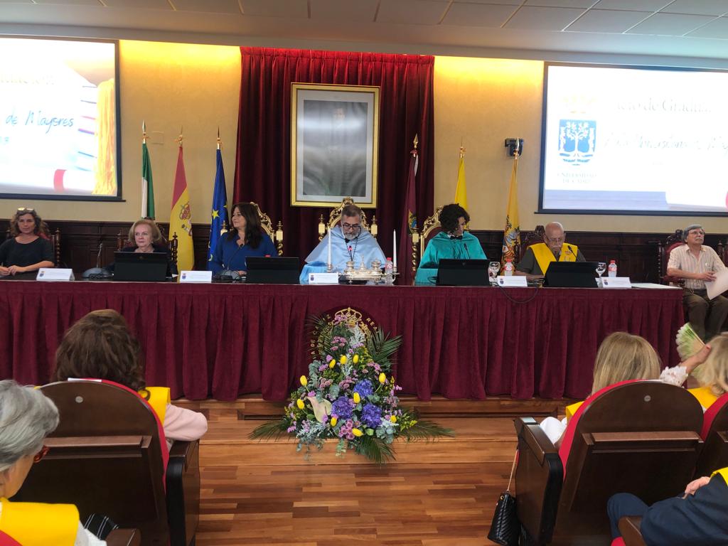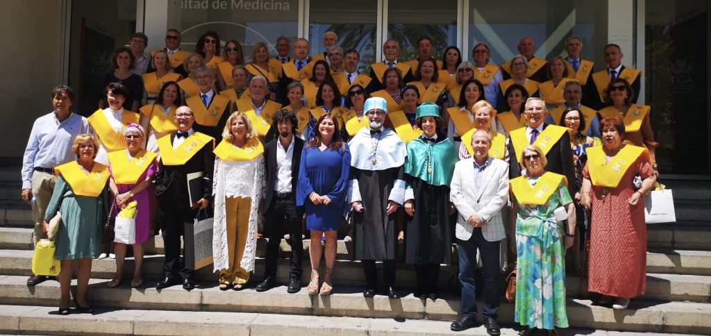 El vicerrector de Estudiantes y Empleo de la Universidad de Cádiz, Manuel Sánchez, en compañía de la concejala delegada de Asuntos Social y de Mayores del Ayuntamiento de Cádiz, Helena Fernández, la subdirectora de la sede de Cádiz del Aula de Universitaria de Mayores, Laura Sánchez, la presidenta de la Asociación Gaudeamus Igitur, Manuela Dávila, y el presidente de la Asociación cultural Aula Permanente, Juan José Almenara, ha presidido – en el salón de Grados de la Facultad de Medicina – la ceremonia de graduación (promoción 2018/2023) del Aula Universitaria de Mayores de Cádiz.