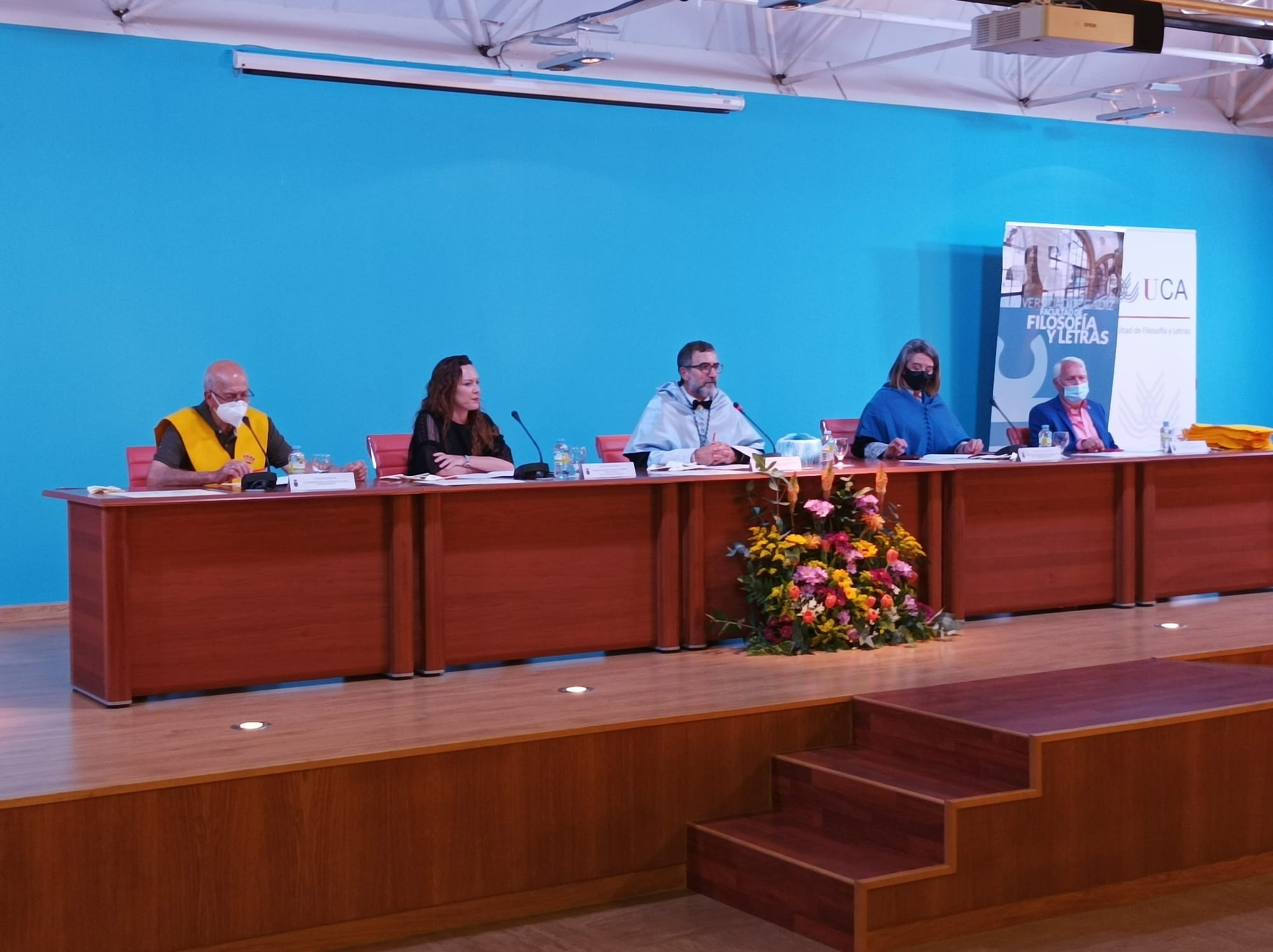 Un total de 72 estudiantes de los cursos 2020/21 y 2021/22 se han graduado hoy en el aula Magna de la Facultad de Filosofía y Letras, el vicerrector de Estudiantes y Empleo, Manuel Sánchez, en compañía del profesorado, les ha dado la enhorabuena.