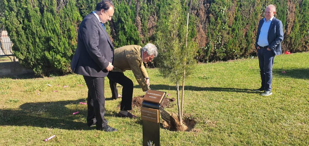 El nuevo doctor Honoris Causa de la Universidad de Cádiz, Gunter Pauli, en compañía del rector de la UCA, Casimiro Mantell, y el decano de la Facultad de Ciencias Económicas y Empresariales y padrino del Honoris Causa, Pedro Araújo, ha plantado esta tarde en el Bosque de los Honoris – en la explanada anterior del Campus de Puerto Real – un Tetraclinis articulata que llevará el nombre del recién investido doctor Honoris Causa.