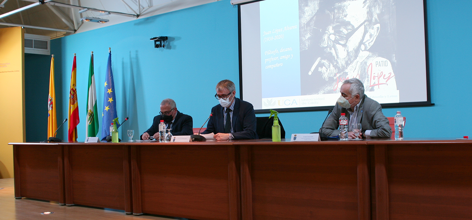 En el transcurso del acto, han tomado la palabra Federico Devis Márquez, profesor titular de la UCA, Ramón Vargas-Machuca, catedrático de la UCA, o Juan Manuel Suárez Japón, catedrático de la Universidad Pablo Olavide y rector de la Universidad Internacional de Andalucía entre 2015 y 2013. A su término, se ha descubierto una placa para rotular con el nombre de Juan López uno de los patios del centro.