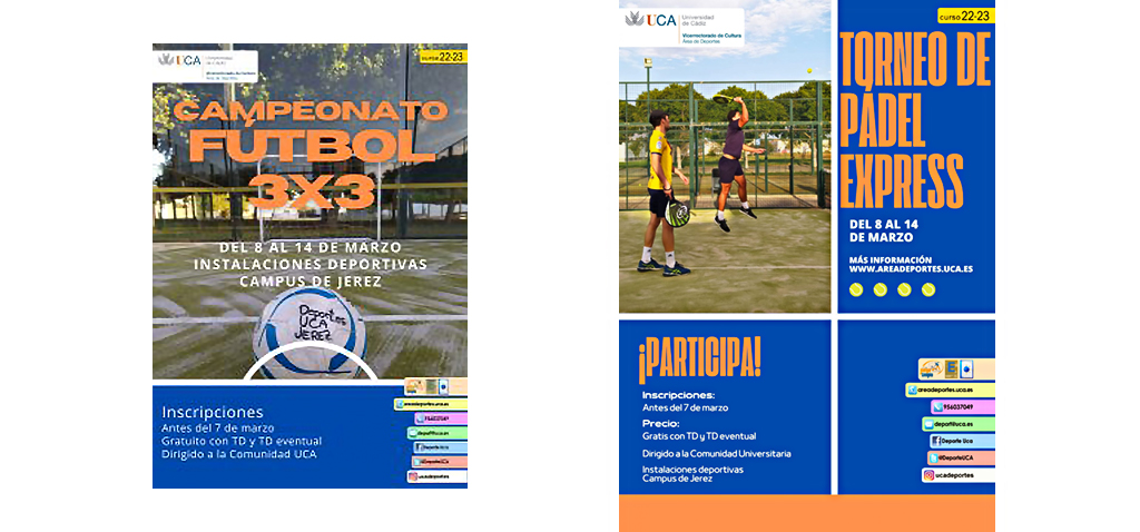 El área de Deportes del Vicerrectorado de Cultura de la Universidad de Cádiz organiza del 8 al 14 de marzo, en las instalaciones deportivas del Campus de Jerez, el I Campeonato UCA Fútbol 3×3 y el Torneo Exprés UCA de Pádel. Las inscripciones pueden hacerse antes del 7 de marzo en la oficina virtual