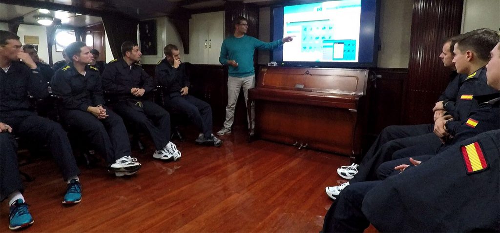 En la primera fase de esta expedición, la travesía entre Cádiz y Las Palmas de Gran Canaria, se ha embarcado personal científico de la Universidad de Cádiz y del Instituto Hidrográfico de la Marina para realizar el adiestramiento de los guardiamarinas que llevarán a cabo el programa de observaciones oceanográficas previsto. Esta actividad forma parte del proyecto piloto que permitirá probar las metodologías de observación para contribuir al seguimiento de los efectos del Cambio Climático y la identificación de zonas de acumulación de basuras marinas y que se desarrollará durante las dos próximas expediciones del buque.