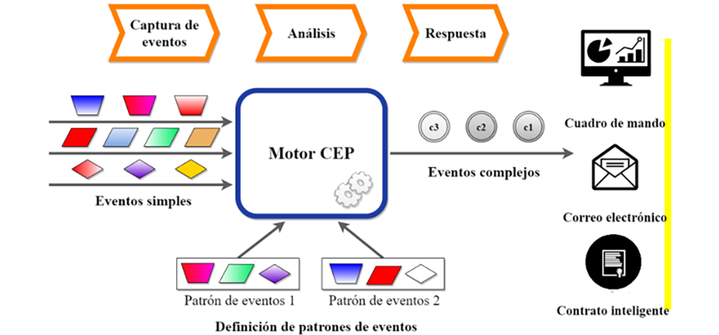 Una de las principales novedades de la solución software CEPchain es que estos contratos pueden ser creados sin saber programarlos a través de su definición gráfica, la transformación automática de los modelos de contrato a código, así como su despliegue en una blockchain en tiempo de ejecución. Asimismo, “estos contratos pueden ser invocados automáticamente desde fuera de la cadena de bloques por parte de un motor de procesamiento de eventos complejos (Complex Event Processing, CEP). Un motor CEP es un software que permite analizar y correlacionar grandes cantidades de datos (big data) con el propósito de detectar en tiempo real situaciones de interés para un dominio particular”, según ha afirmado el investigador de la UCA. Para ello, es necesario implementar los patrones de eventos, donde se definan las condiciones que deben cumplirse para detectar dichas situaciones. Por tanto, “cuando se satisfagan las condiciones de un patrón modelado con este software, se invocarán automáticamente las funciones del contrato inteligente vinculadas a dicho patrón”.