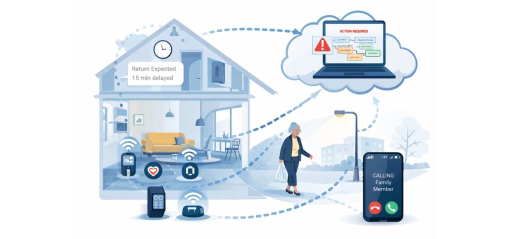 Para entender mejor esta investigación, dentro de esta publicación se presenta a modo de ejemplo un caso de uso centrado en la asistencia a personas mayores en el hogar. El sistema combina señales de distintos sensores para interpretar una actividad cotidiana como salir a tirar la basura y volver a casa. Si la persona no regresa en el tiempo esperado, el sistema puede generar una alerta y seleccionar la respuesta adecuada según el contexto, por ejemplo, ajustando el umbral de tiempo si cambian condiciones relevantes, como tener que desplazarse más porque el contenedor habitual está lleno.