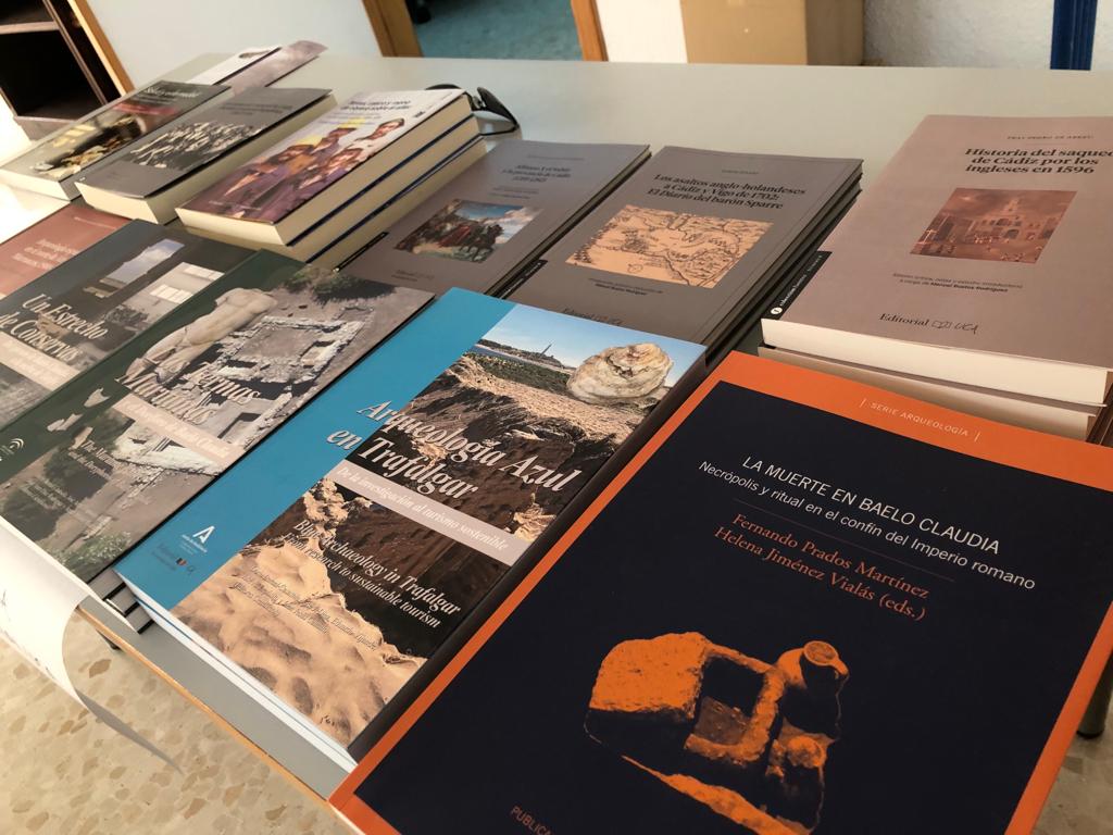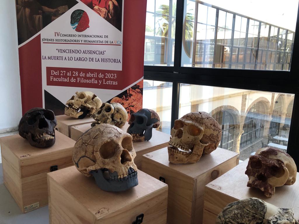 En el hall de la Facultad se ha instalado un stand de libros y dos exposiciones, una sobre los trabajos desarrollados en Trafalgar y otra, con una colección de referencia de cráneos de diferentes especies evolutivas.