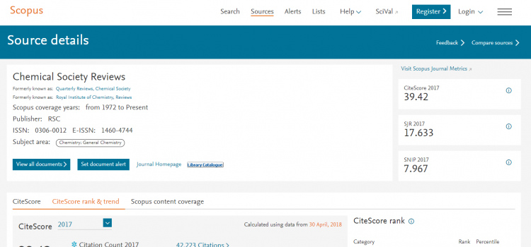 El Scimago Journal & Country Rank y CiteScore es un indicador de impacto de una publicación que se basa en la información incluida en la base de datos Scopus, de la empresa Elsevier. Ha sido desarrollado por SCImago, grupo de investigación del Consejo Superior de Investigaciones Científicas (CSIC), y de las universidades de Granada, Extremadura, Carlos III (Madrid) y Alcalá de Henares. SJR otorga un peso determinado a las citas de una revista, en función del área científica y la relevancia de las revistas citantes. Para el cálculo, usa una ventana de citación de tres años y restringe las autocitas para que sólo constituyan el 33% del cómputo. La edición de 2017 incluye 34.171 revistas, de las que 571 son españolas.