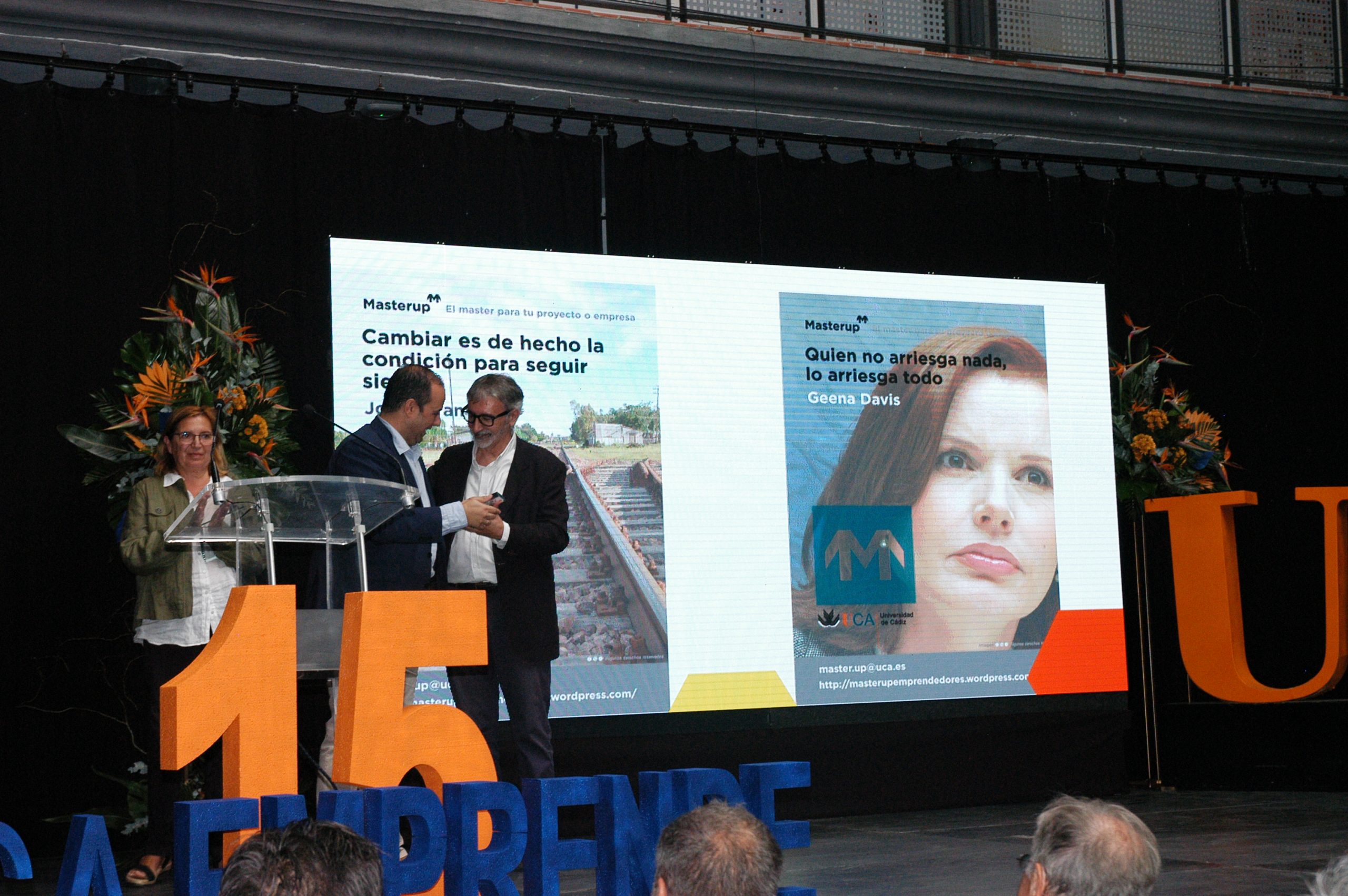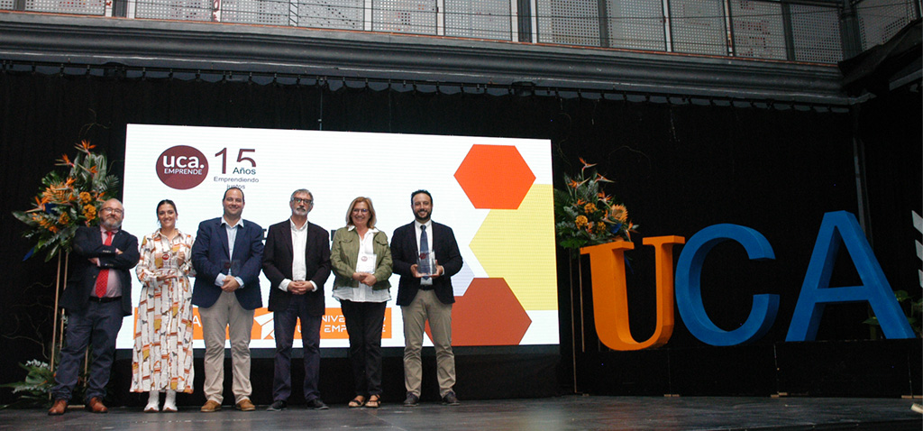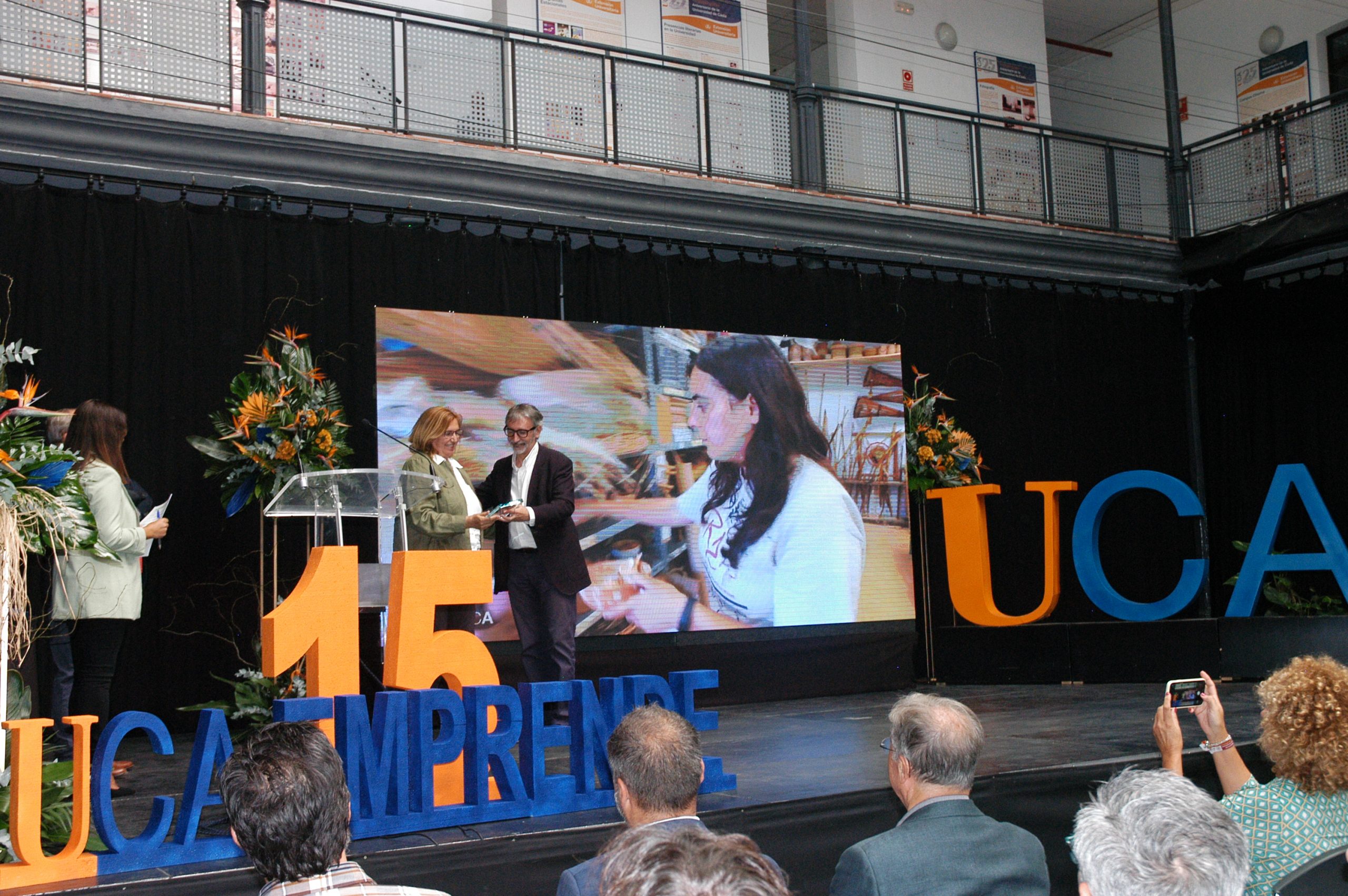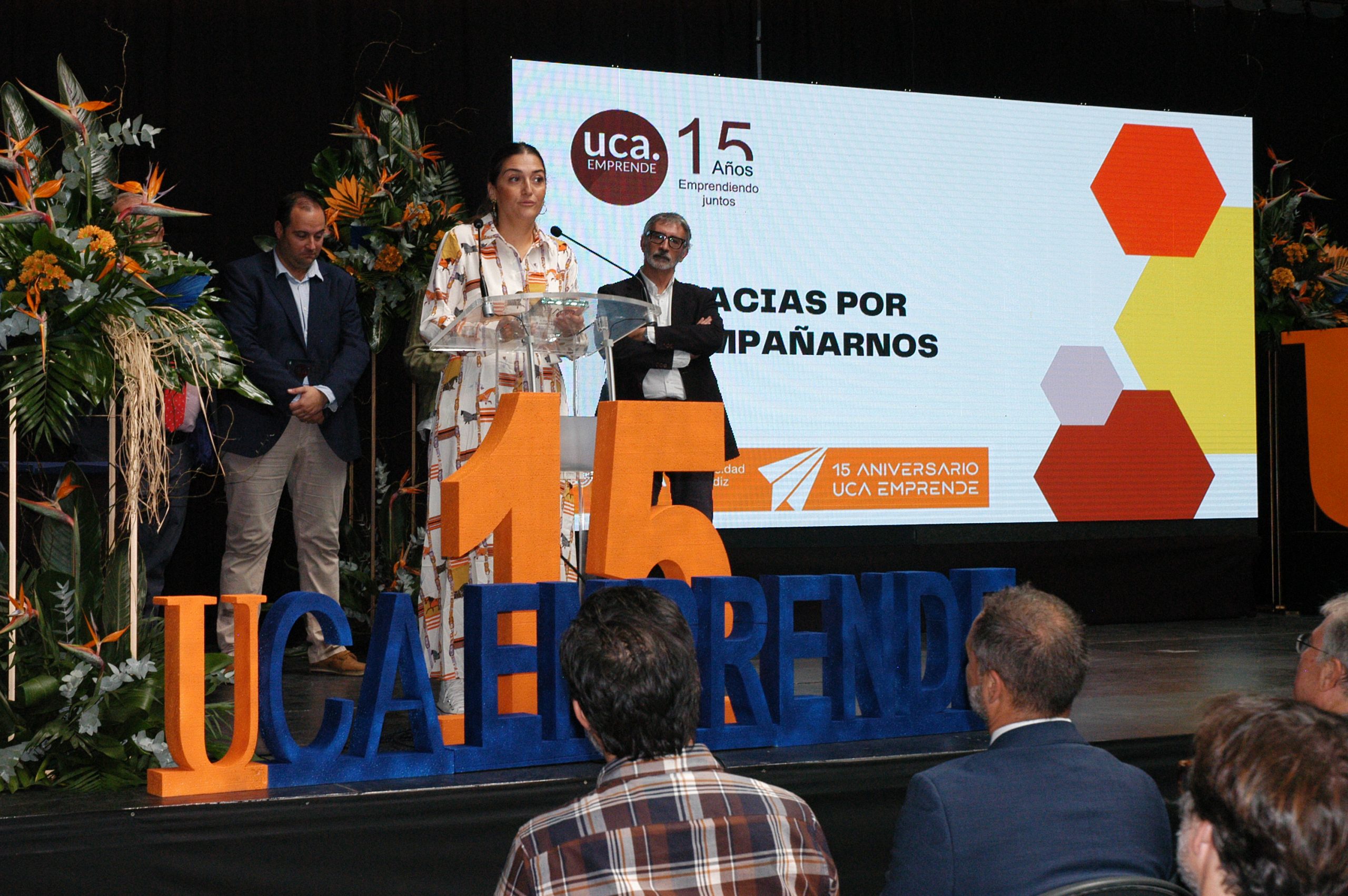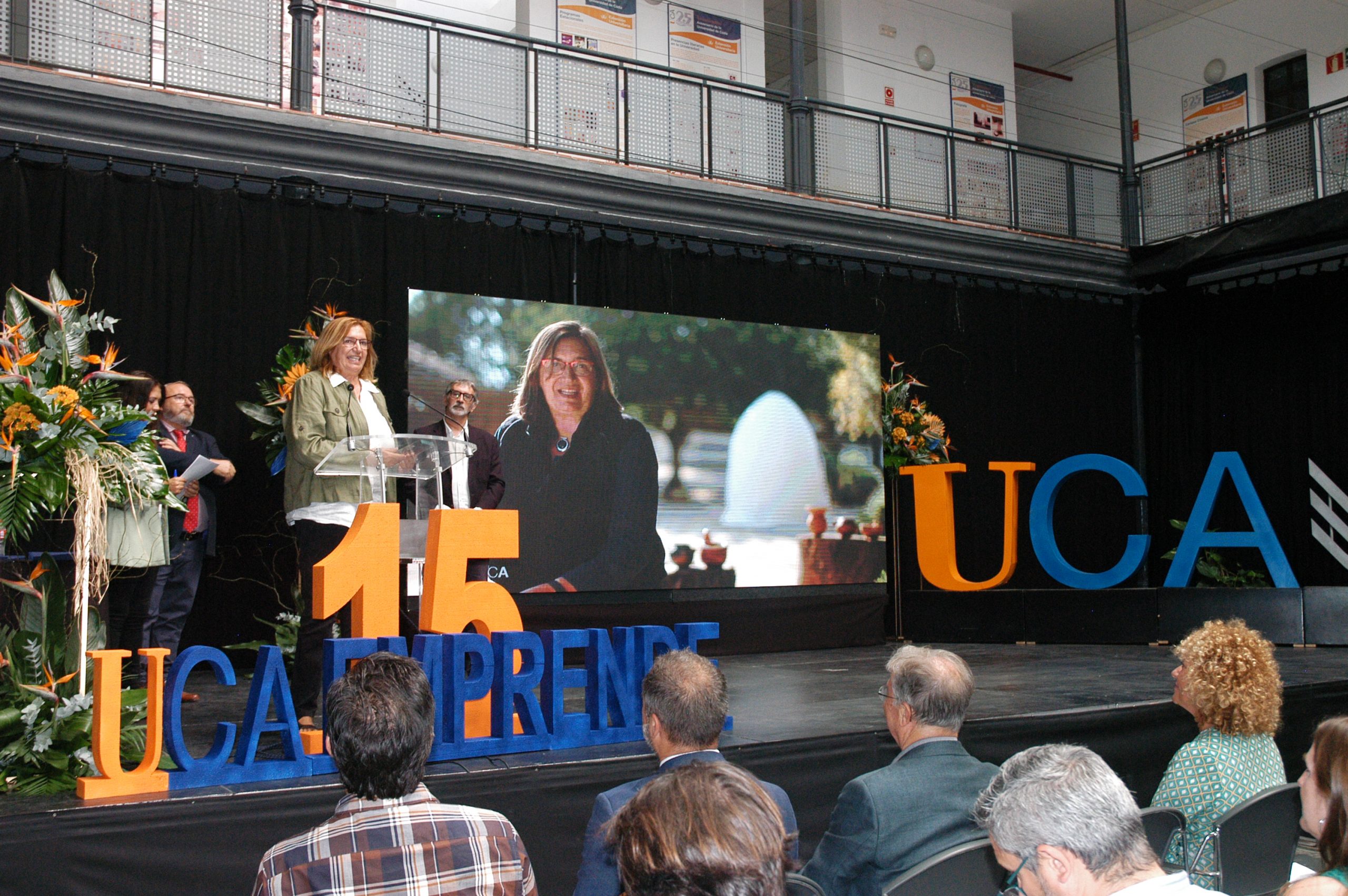 A continuación, las autoridades han hecho entrega de reconocimientos a proyectos inspiradores y colaboradores durante estos tres quinquenios. En primer lugar, a Rita Benítez, egresada de la UCA y fundadora de la empresa Era Cultura – Laboratorio de Arqueología Experimental, la primera empresa del sector de industrias culturales gaditanas con 20 años de experiencia. Después, al máster oficial en Creación de Empresas, Nuevos Negocios y Proyectos Innovadores (Masterup) de la Universidad de Cádiz, que en este curso celebra su décimo aniversario, una década en la que han ofrecido formación especializada a 200 personas de 23 países diferentes con una tasa de inserción laboral del 100%. Seguidamente, a una joven emprendedora gaditana y antigua alumna de la UCA, Begoña Arana, que fundó Nuevo Hogar Betania, en 2011, una entidad sin ánimo de lucro con un equipo de más de un centenar de trabajadores que tiene como fin promocionar y empoderar al ser humano. Y en último caso, a la empresa Surcontrol como la primera empresa de base tecnológica que surgió con el servicio de atención a la persona emprendedora de la UCA. Una EBT que nació de un grupo de investigación y la cooperación de profesorado y alumnado de la entonces Escuela Universitaria de Ingeniería Técnica Naval.