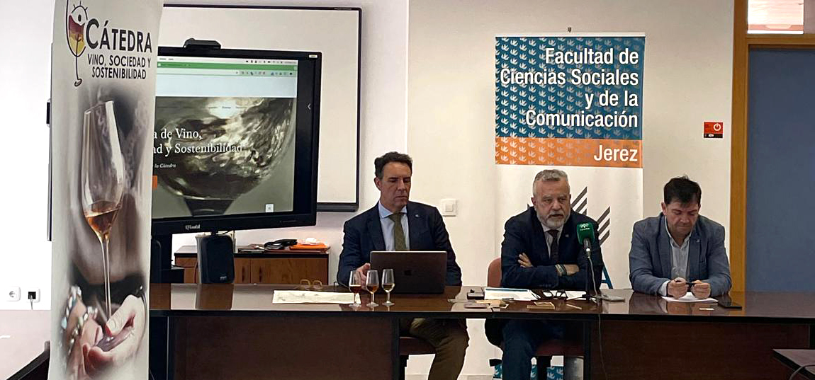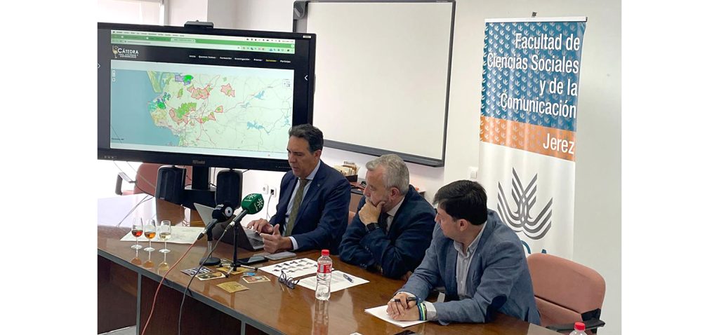 La Cátedra Vino, Sociedad y Sostenibilidad de la Universidad de Cádiz lidera el proyecto del mapa interactivo de Pagos y Viñedos del Marco de Jerez. El decano de la Facultad de Ciencias Sociales y de la Comunicación, José Antonio López, junto al director de la Cátedra Vino, Sociedad y Sostenibilidad, Serafín Cruces, y el investigador del departamento de Ingeniería Informática de la UCA, José Miguel Mota, han presentado hoy los detalles en la sala de Juntas II del edificio de Despachos y Seminarios del Campus de Jerez.
