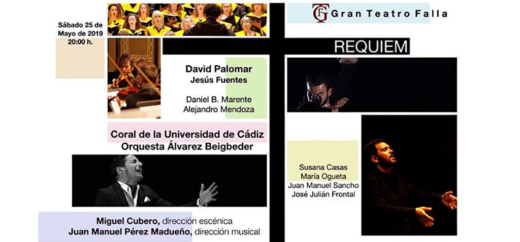La Coral de la Universidad de Cádiz y la Orquesta Álvarez Beigbeder, bajo la dirección escénica de Miguel Cubero y la música de Juan Manuel Pérez Madueño, ofrecerán su próximo concierto el sábado 25 de mayo, a las 20 horas, en el Gran Teatro Falla, donde interpretarán Réquiem de Mozart. Una actuación especial que reúne la música clásica con el flamenco, con la participación del equipo artístico formado por David Palomar (cantaor), Susana Casas (soprano), María Ogueta (contralto), Juan Manuel Sancho (tenor) y José Julián Forntal (barítono).