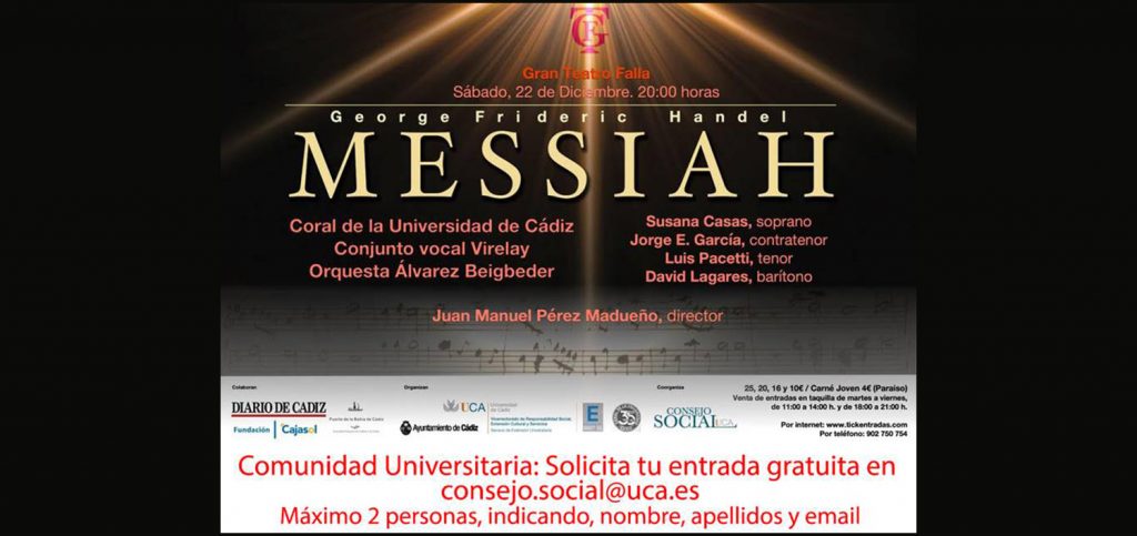 En esta edición, la Coral de la UCA interpretará El Mesías HWV 56, el famoso oratorio y una de las obras más monumentales de la historia compuesta por Georg Friedrich Händel en 1741, junto a otros grupos como Virelay o la Orquesta Álvarez Beigbeder bajo la dirección de Juan Manuel Pérez Madueño.