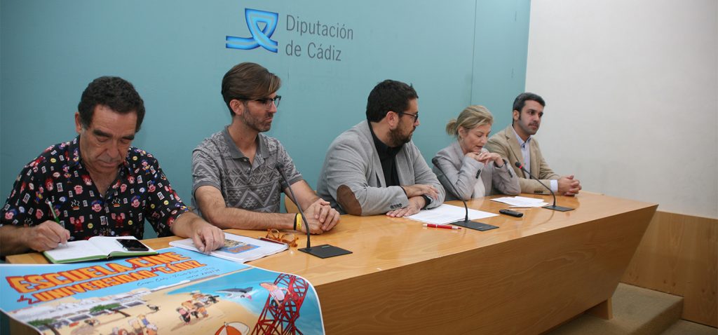 La Universidad de Cádiz ha presentado la cuarta edición de la Escuela de Cine del Servicio de Extensión Universitaria del Vicerrectorado de Responsabilidad Social, Extensión Cultural y Servicios de la UCA en el Palacio Provincial de la Diputación de Cádiz. La vicerrectora de la UCA, Teresa García, junto al diputado del área de Desarrollo Económico y Servicios a la Ciudadanía de la Diputación Provincial de Cádiz, Jaime Armario, al responsable del Centro Unicaja de Cultura de Cádiz de la Fundación Unicaja, Javier Vela, el coordinador técnico de la Escuela de Cine de la Universidad de Cádiz, Bruto Pomeroy, y el director fotográfico y profesor este año del primer módulo, Daniel Sánchez, han explicado el programa que aglutina ponentes de prestigio como Albert Boadella, Fernando Colomo, Pepe Vivuela, Arantxa Echevarría, Fernando Franco, Javier Coronilla, Javier León, Pedro Rodríguez o Patricia Mota.