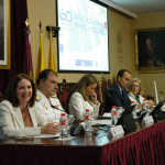 La vicerrectora de Política Científica y Tecnológica de la Universidad de Cádiz, Mª Jesús Mosquera, acompañada por el vicealmirante y director de Ingeniería y Construcciones Navales de la JAL (ADIC), Manuel Antonio Martínez Ruiz, el secretario General de Investigación e Innovación de la Consejería de Universidad, Investigación e Innovación de la Junta de Andalucía, Pablo Cortés, la directora de la Escuela de Ingeniería Naval y Oceánica, Victoria Redondo, y la decana del Colegio Oficial de Ingenieros Navales y Oceánicos de España, Pilar Tejo, ha presidido hoy, en el salón de Grados de la Facultad de Medicina, este acto institucional de agradecimiento a la colaboración de instituciones y empresas en el marco del 60º aniversario de su creación.