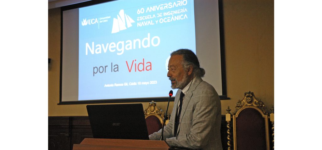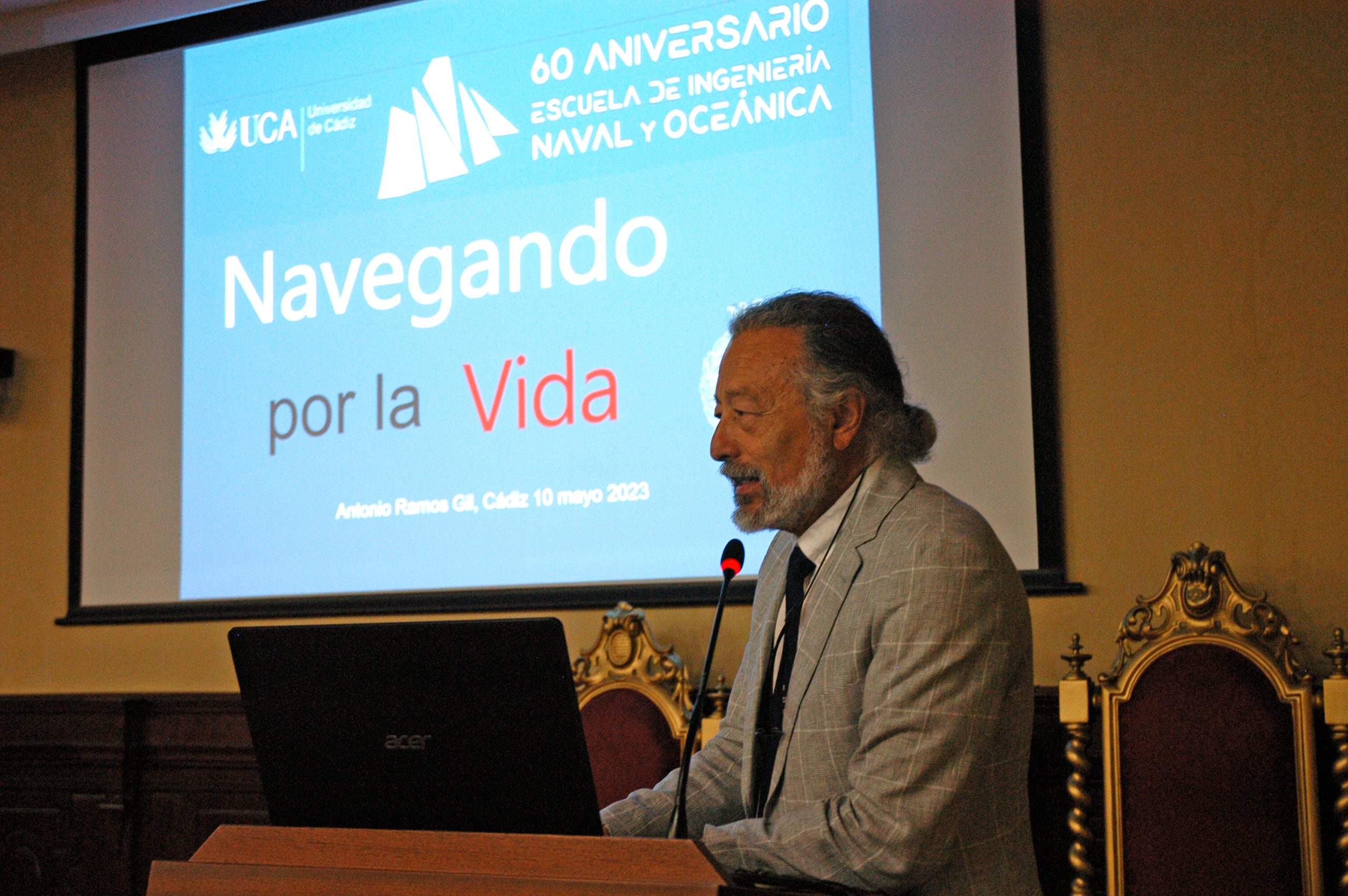 El perito Naval, economista e historiador Antonio Ramos Gil, egresado de la primera promoción de esta Escuela, ha inaugurado las sesiones de ponencias, con su conferencia titulada Navegando por la vida. En su intervención, se ha centrado en la dimensión humana, según sus palabras especialmente dirigida a los estudiantes: que debe primar en todas las facetas de la vida. Además, de la técnica. Y en “ese periplo, hablaremos de la importancia de la navegación en la historia de la humanidad”.