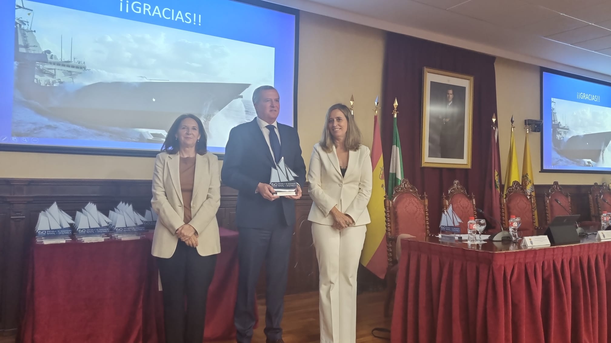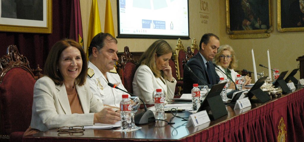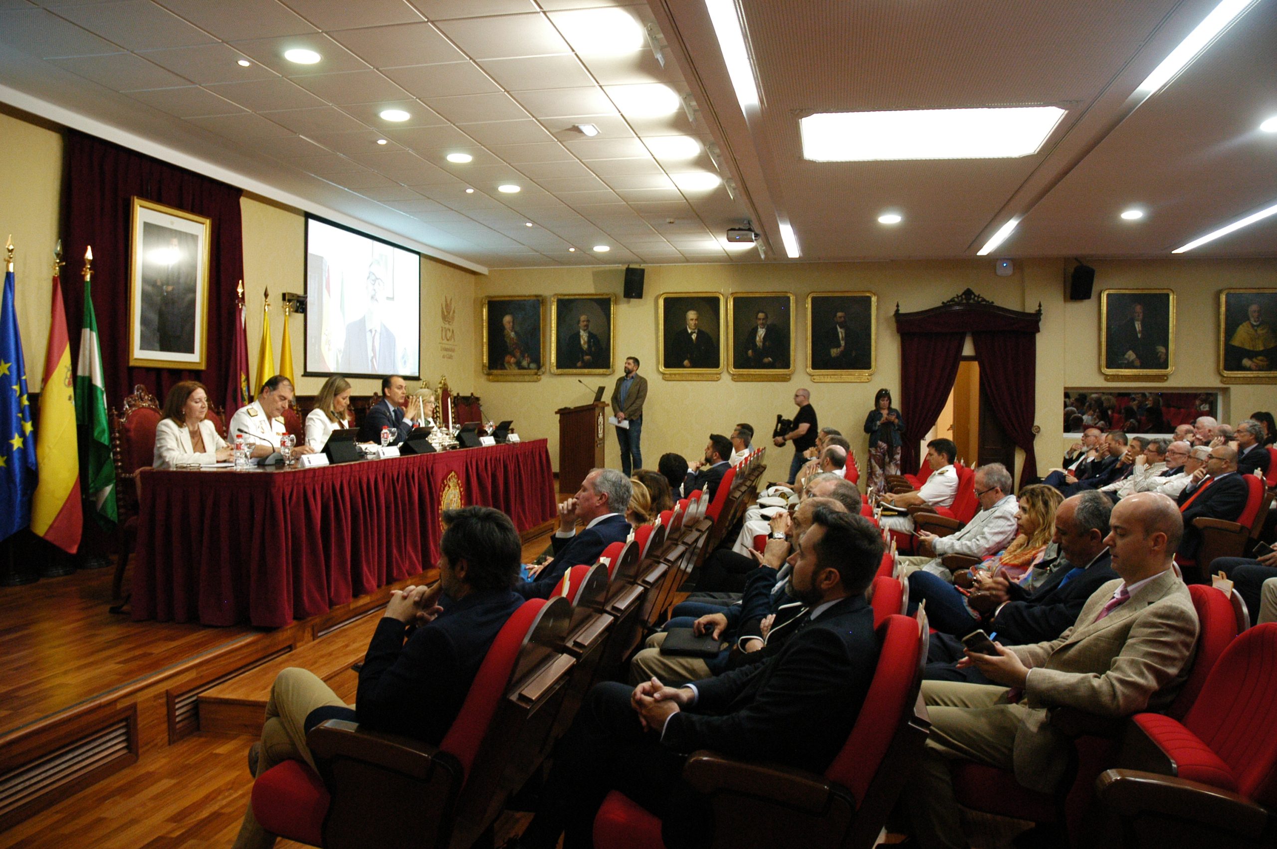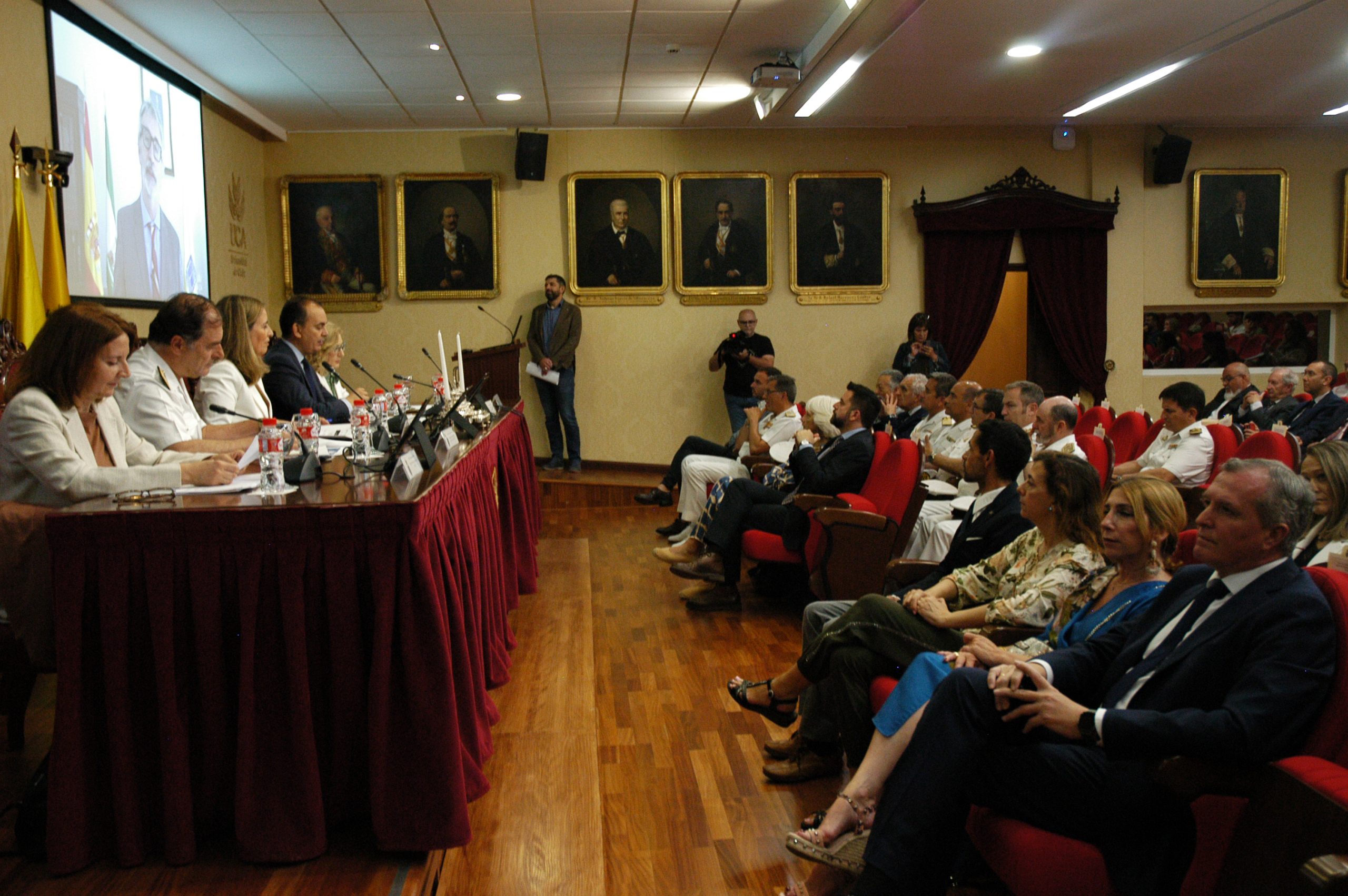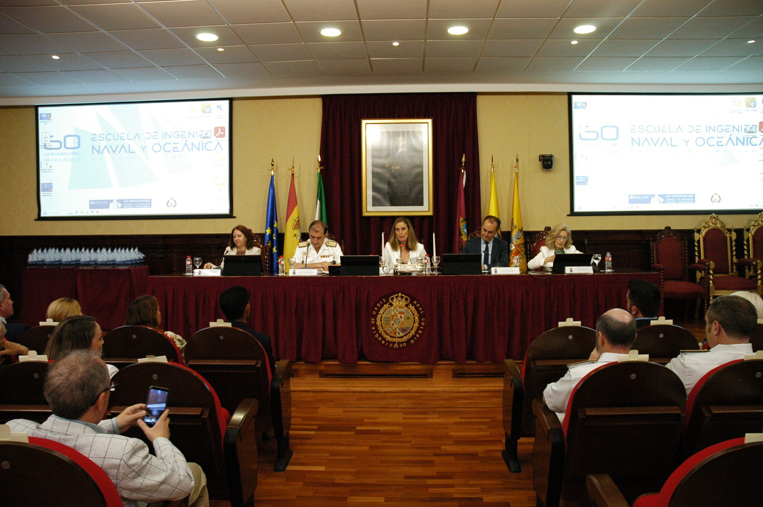 La vicerrectora de Política Científica y Tecnológica de la Universidad de Cádiz, Mª Jesús Mosquera, acompañada por el vicealmirante y director de Ingeniería y Construcciones Navales de la JAL (ADIC), Manuel Antonio Martínez Ruiz, el secretario General de Investigación e Innovación de la Consejería de Universidad, Investigación e Innovación de la Junta de Andalucía, Pablo Cortés, la directora de la Escuela de Ingeniería Naval y Oceánica, Victoria Redondo, y la decana del Colegio Oficial de Ingenieros Navales y Oceánicos de España, Pilar Tejo, ha presidido hoy, en el salón de Grados de la Facultad de Medicina, este acto institucional de agradecimiento a la colaboración de instituciones y empresas en el marco del 60º aniversario de su creación.
