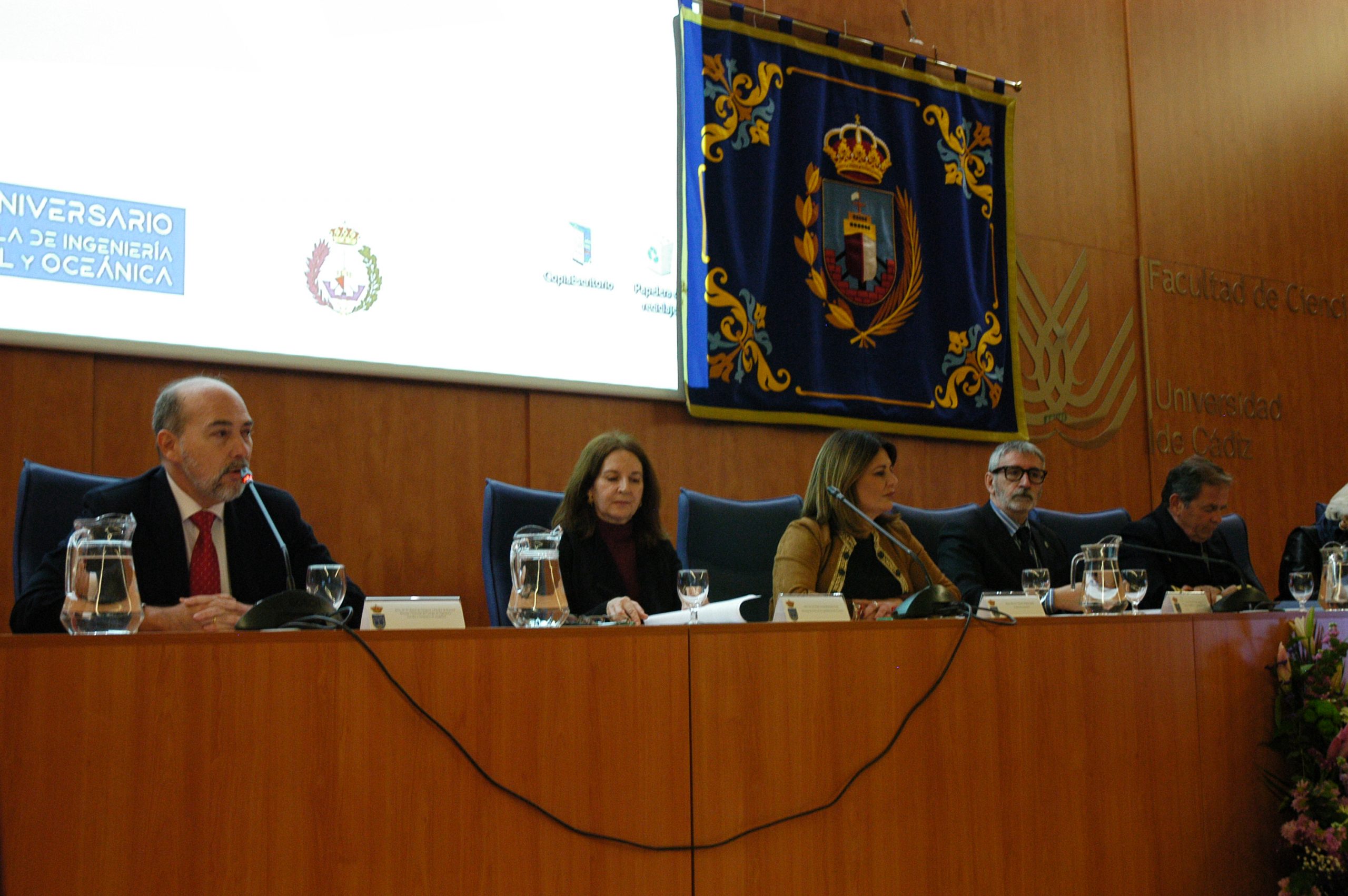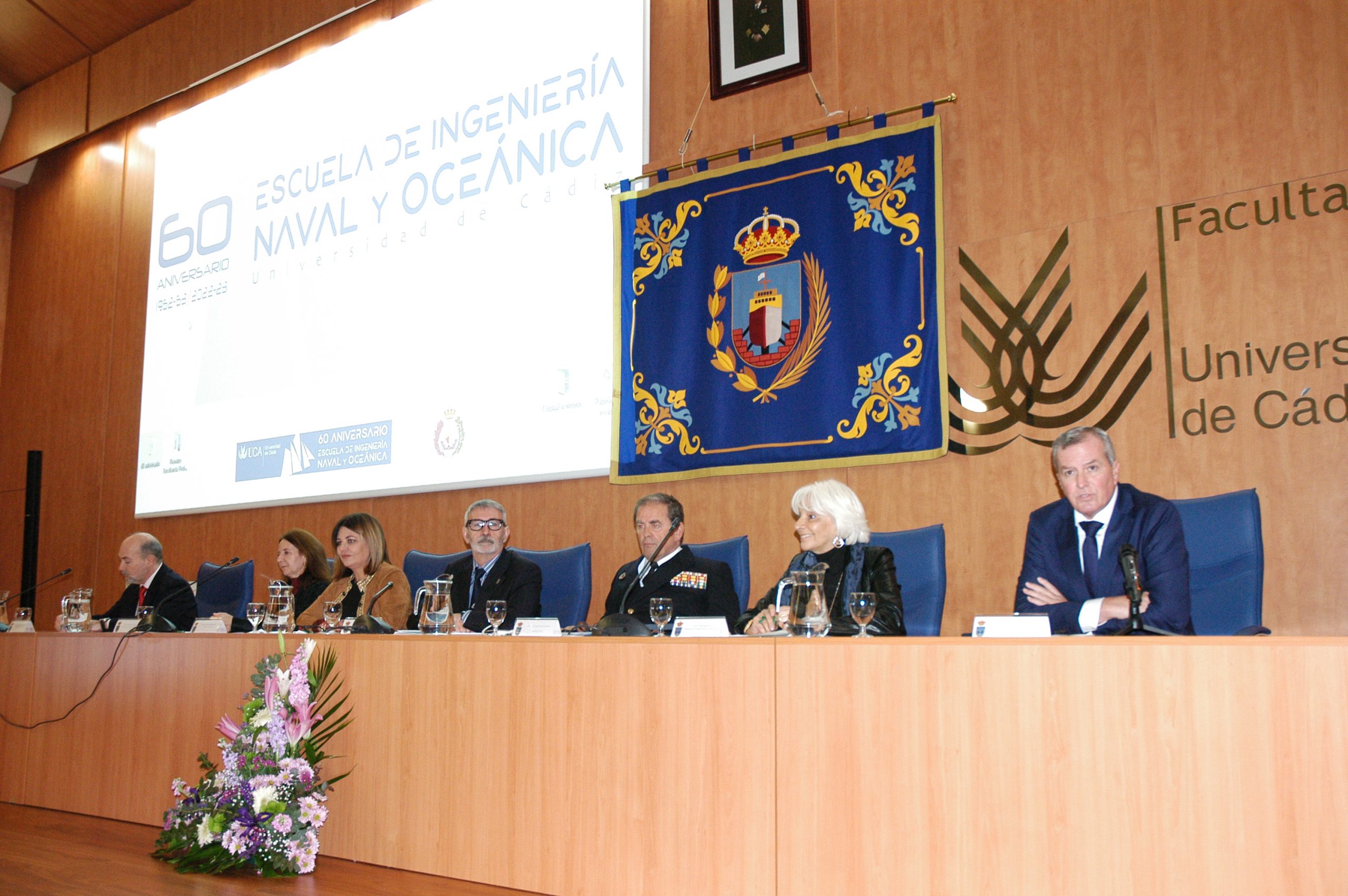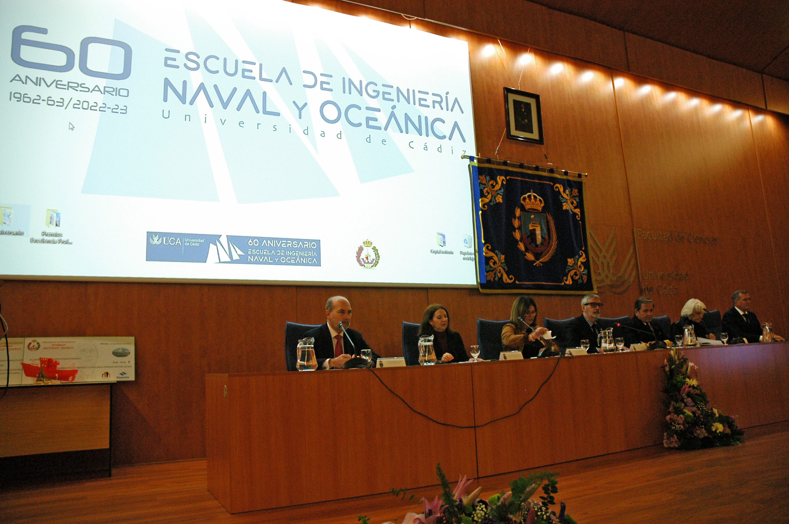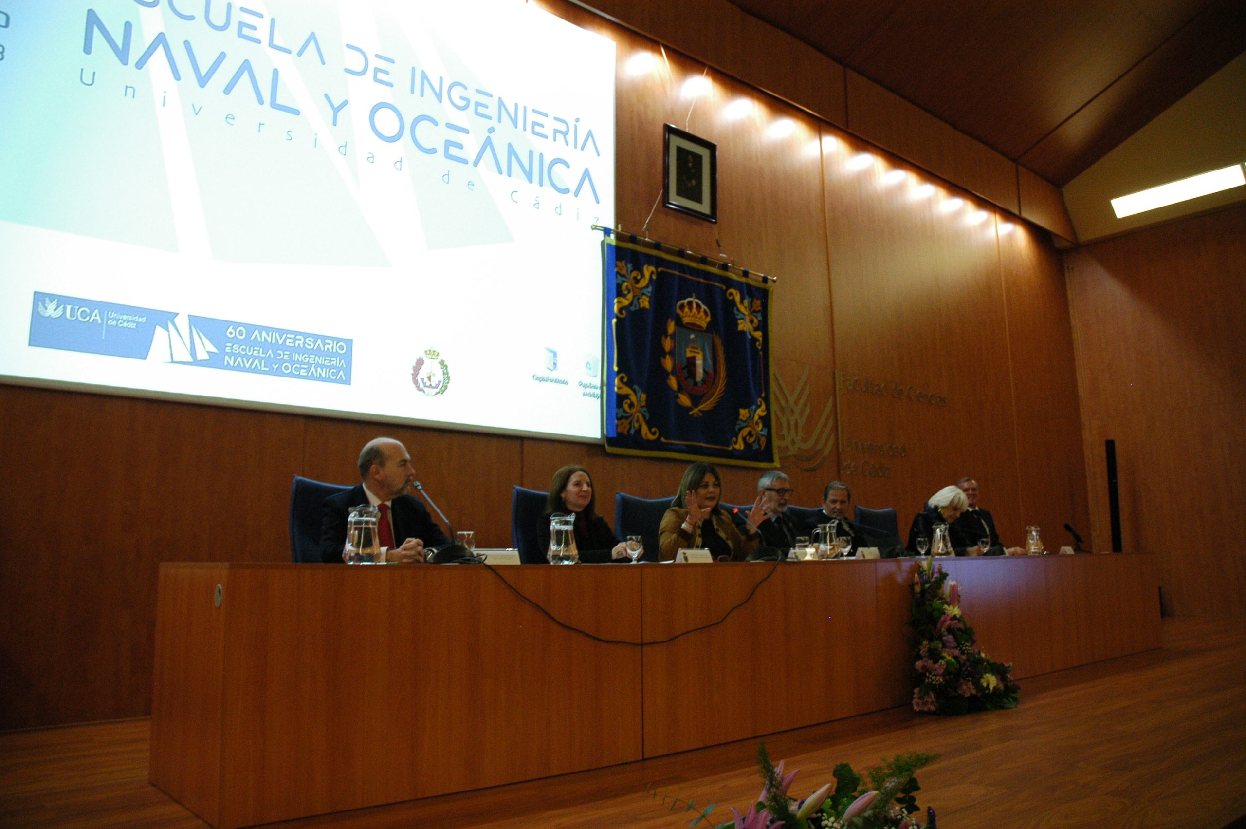 El rector de la Universidad de Cádiz, Francisco Piniella, acompañado por la alcaldesa de Puerto Real, Elena Amaya, y la directora de la Escuela de Ingeniería Naval y Oceánica, Victoria Redondo, ha presidido esta mañana, en el salón de Actos de la Facultad de Ciencias, el acto inaugural del programa conmemorativo del 60º aniversario de la Escuela de Ingeniería Naval y Oceánica. Les han acompañado en la mesa de apertura el almirante de la Flota de la Armada Española, Eugenio Díaz del Río, la presidenta de la Autoridad Portuaria de la Bahía de Cádiz, Teófila Martínez, el vicedecano del Colegio de Ingenieros Navales de España, Rafael de Góngora, y el director de la unidad de Negocio de Corbetas y BAM, José Antonio Rodríguez.