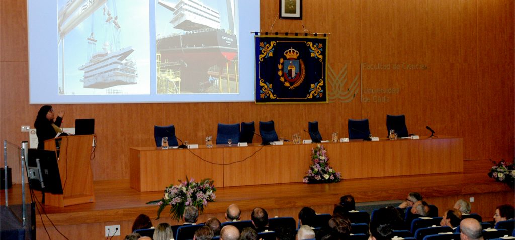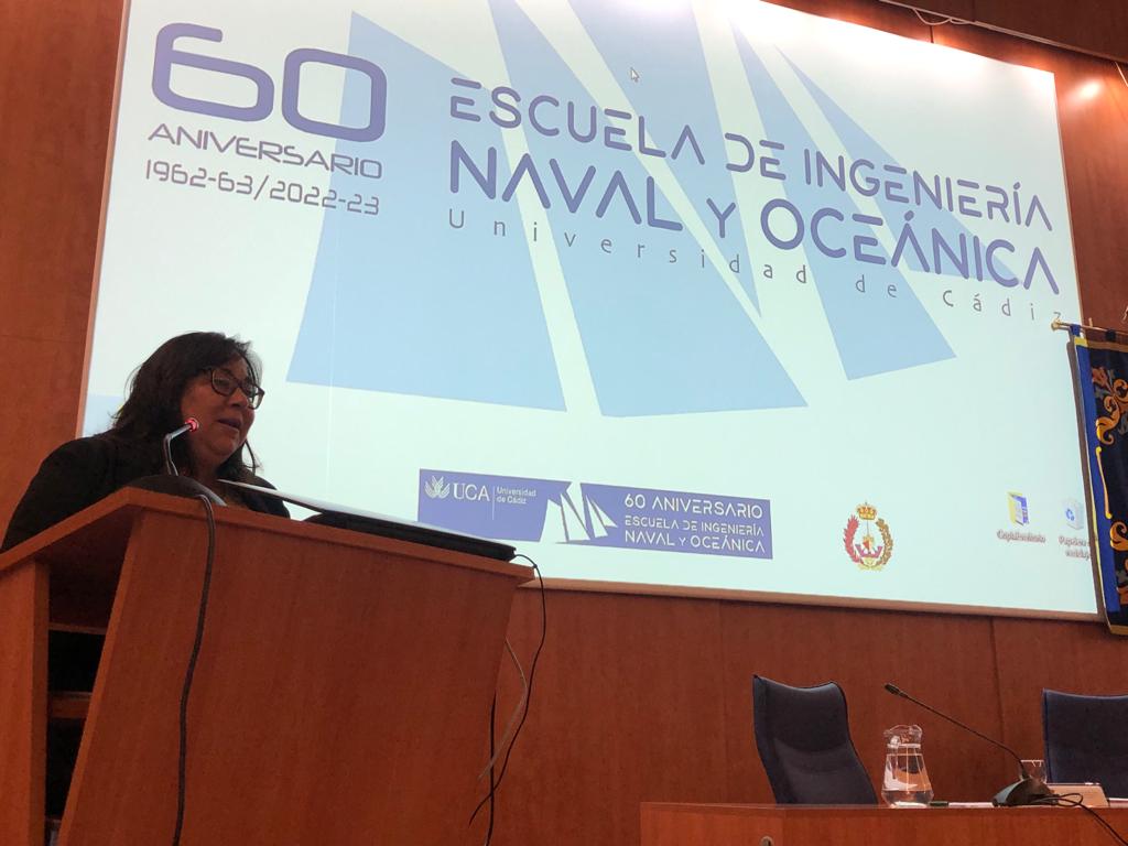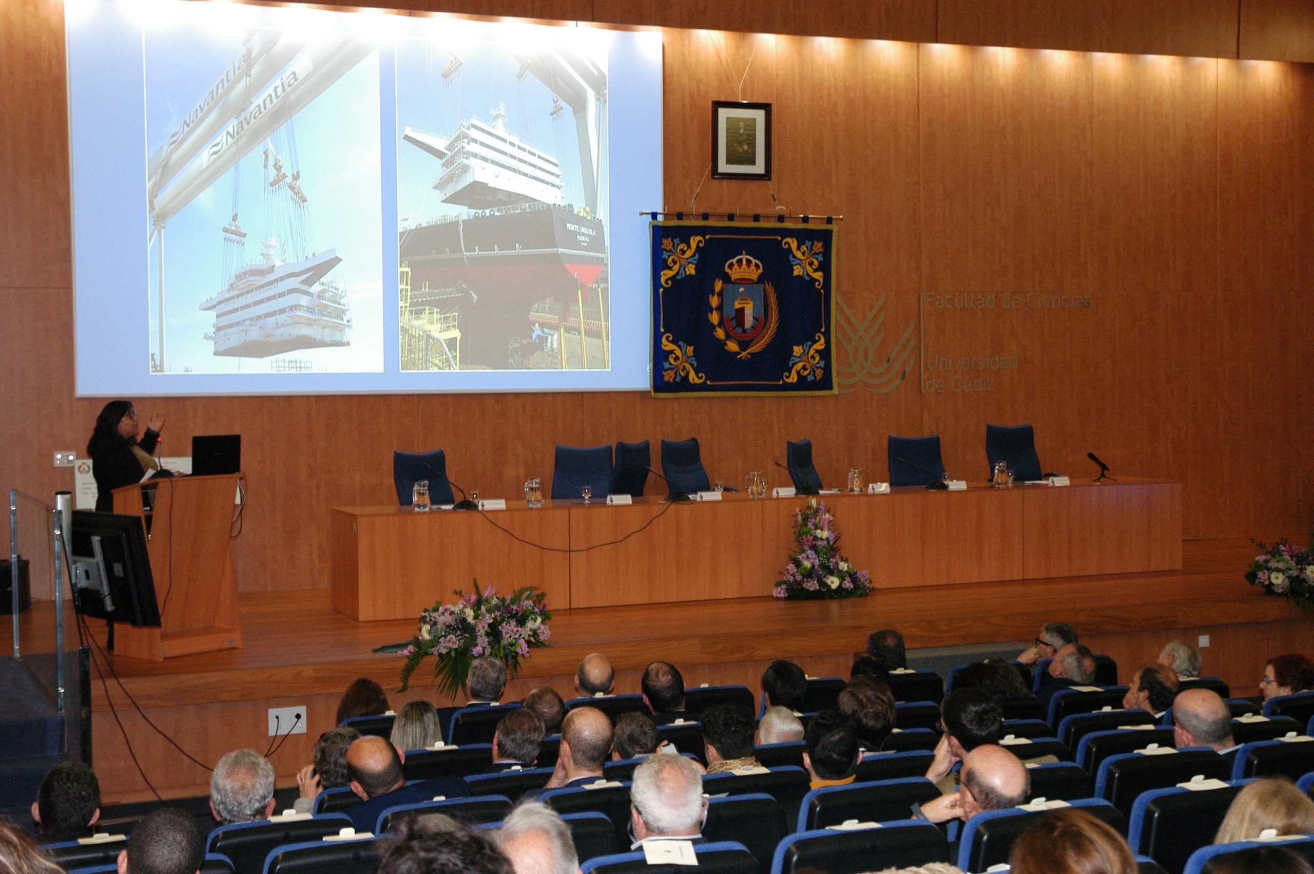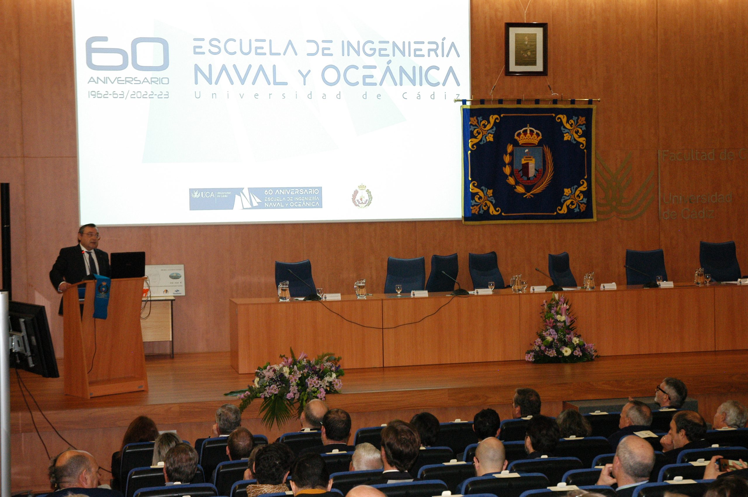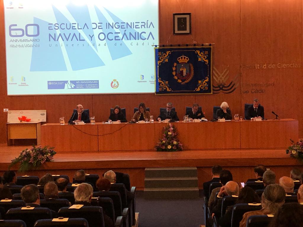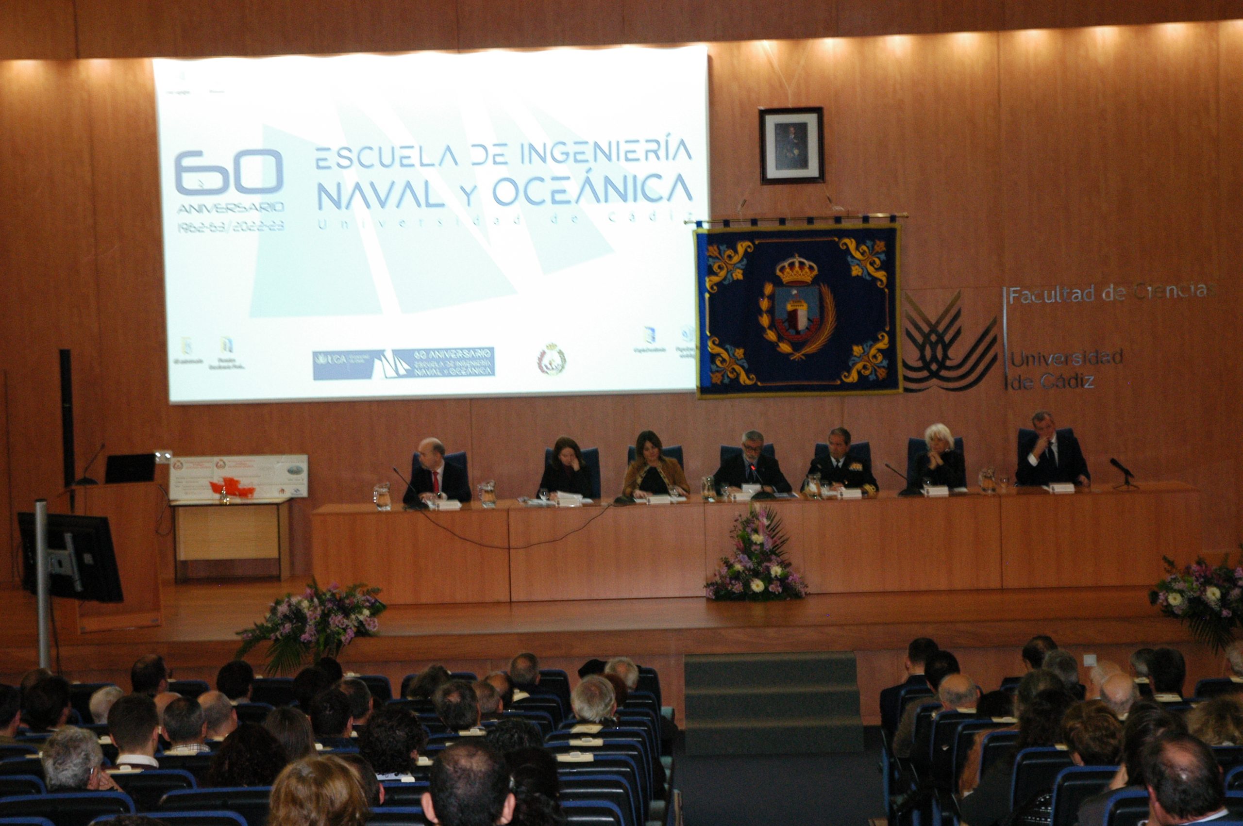 El rector de la Universidad de Cádiz, Francisco Piniella, acompañado por la alcaldesa de Puerto Real, Elena Amaya, y la directora de la Escuela de Ingeniería Naval y Oceánica, Victoria Redondo, ha presidido esta mañana, en el salón de Actos de la Facultad de Ciencias, el acto inaugural del programa conmemorativo del 60º aniversario de la Escuela de Ingeniería Naval y Oceánica. Les han acompañado en la mesa de apertura el almirante de la Flota de la Armada Española, Eugenio Díaz del Río, la presidenta de la Autoridad Portuaria de la Bahía de Cádiz, Teófila Martínez, el vicedecano del Colegio de Ingenieros Navales de España, Rafael de Góngora, y el director de la unidad de Negocio de Corbetas y BAM, José Antonio Rodríguez.