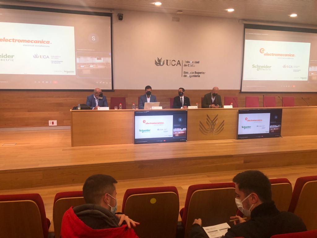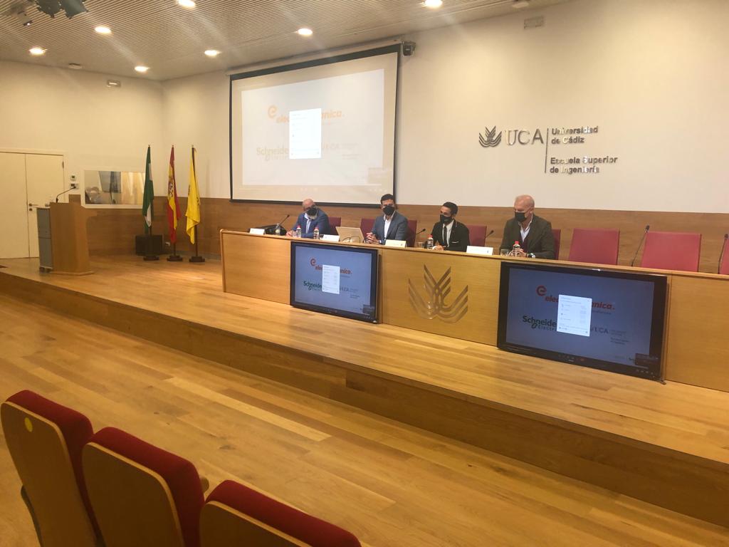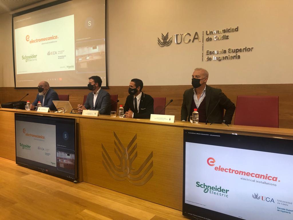 La Universidad de Cádiz, desde el Vicerrectorado de Digitalización e Infraestructuras, celebra hoy, en la Escuela Superior de Ingeniería, la jornada Nuevos sistemas de movilidad personal, sostenible y responsable, en los campus universitarios UCA. El vicerrector de Digitalización e Infraestructuras de la UCA, Carlos Rioja, en compañía del director de la Oficina de Recursos Externos, José Ramón Martínez Tabares, y el delegado de Schneider Electric en Cádiz y el gerente de Electromecánica de Mantenimiento, Fernando Navarro y Jesús Rivas, respectivamente, les han dado la bienvenida en la ESI.