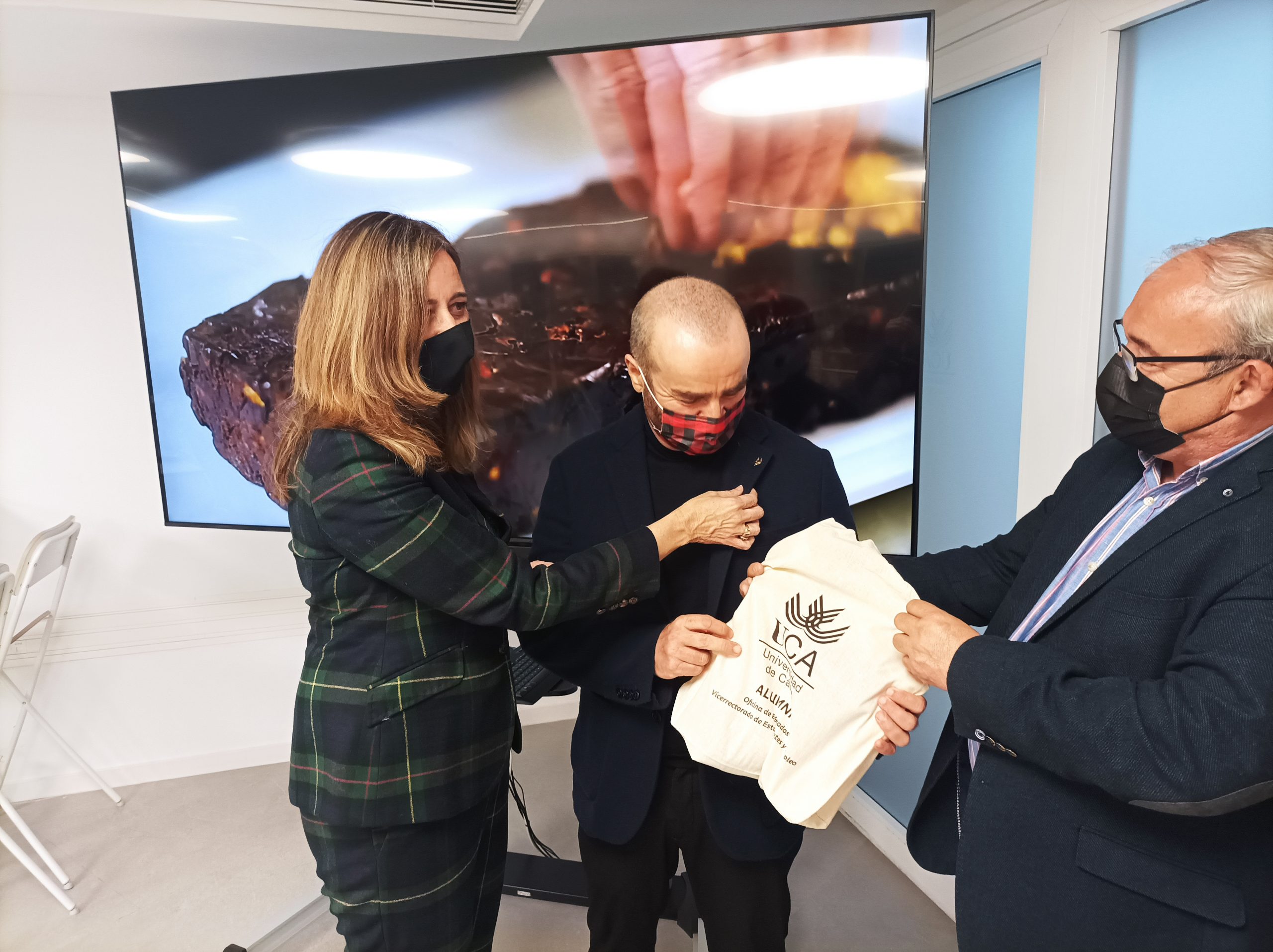 La vicerrectora de Política Científica y Tecnológica de la UCA junto al director General de Emprendimiento, Empresa y Egresados, Mª Jesús Mosquera y José Sánchez, y su promotor Pedro Álvarez han dado la bienvenida en el acto de apertura. Con la presencia del director de la oficina de Egresados de la UCA, Rafael Rivas, se le ha entregado como egresado una insignia de su universidad.