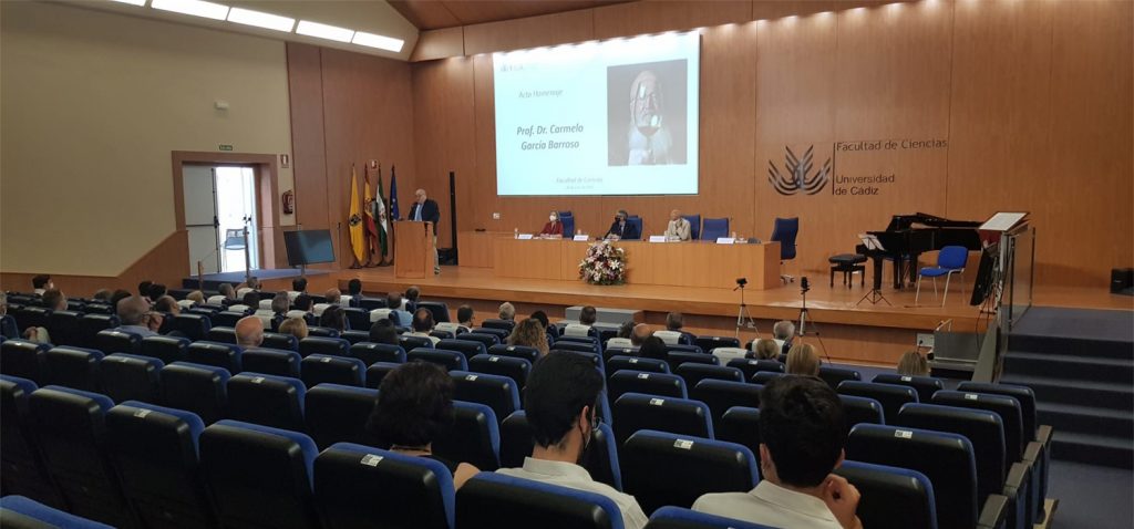 El catedrático de Química Analítica, Dominico Guillén, ha confesado que se trata de “homenajear a un maestro y amigo. Hace hoy un año y cinco días de su fallecimiento”. En 1979, ha relatado, que Carmelo García Barroso se incorpora al departamento de Química Analítica como profesor. Su tesis fue “el ariete y la puerta abierta” a otras muchas tesis y a colaboraciones con empresas. Es el investigador UCA con mayor indicador H44, con cientos de publicaciones y una investigación financiada con proyectos competitivos por casi 3 millones de euros. Entre sus logros, ha mencionado que fue director y fundador de la OTRI, “en su ADN estaba transferencia y divulgación. Logró 48 contratos con empresas”. Y este vínculo también lo tenía con los estudiantes y la sociedad, “conectaba fácil con sus alumnos. Era una persona cercana y con gran motivación. Coordinaba en cada edición, un seminario en los Cursos de Otoño de Jerez y se volcaba con la divulgación como es el caso de La noche de los Investigadores”.
