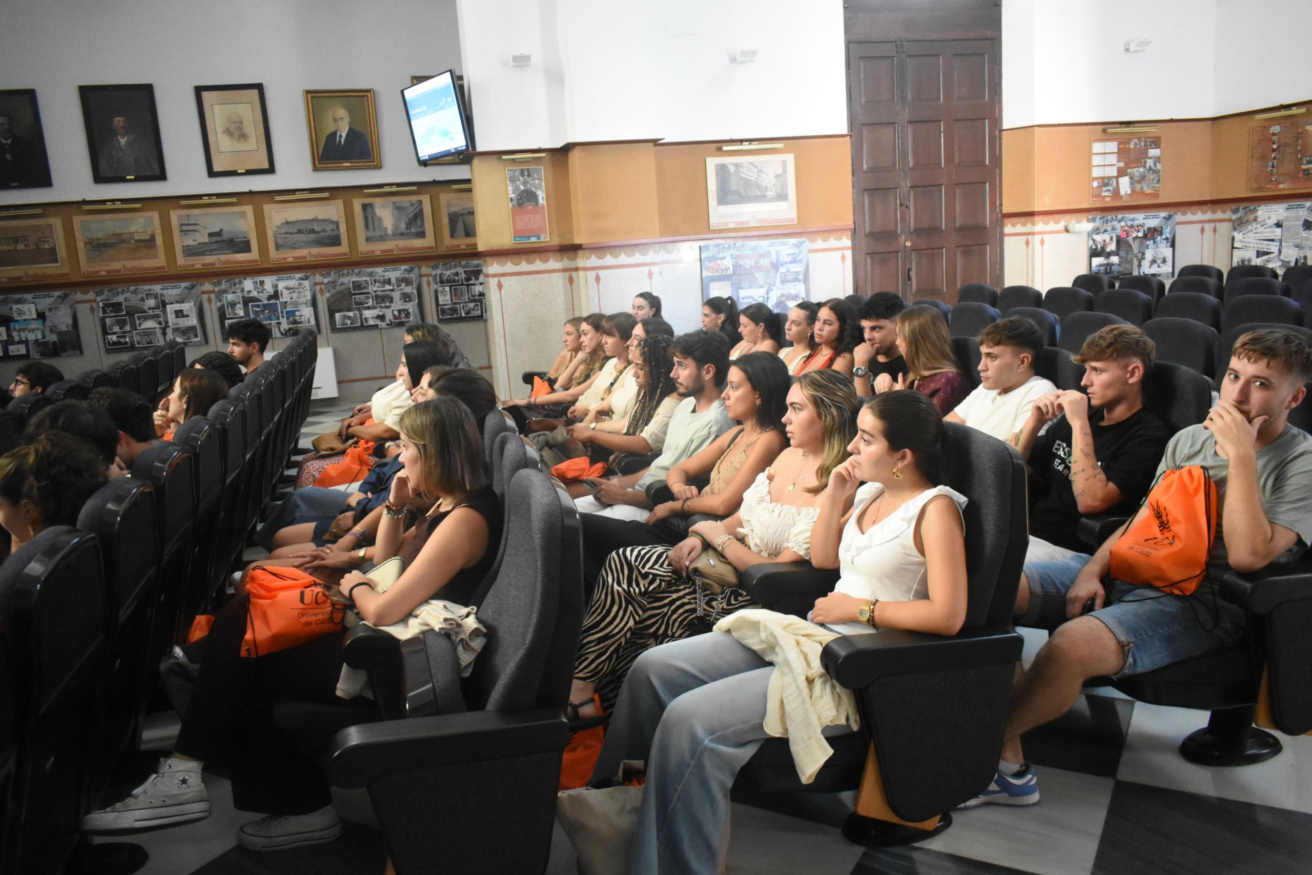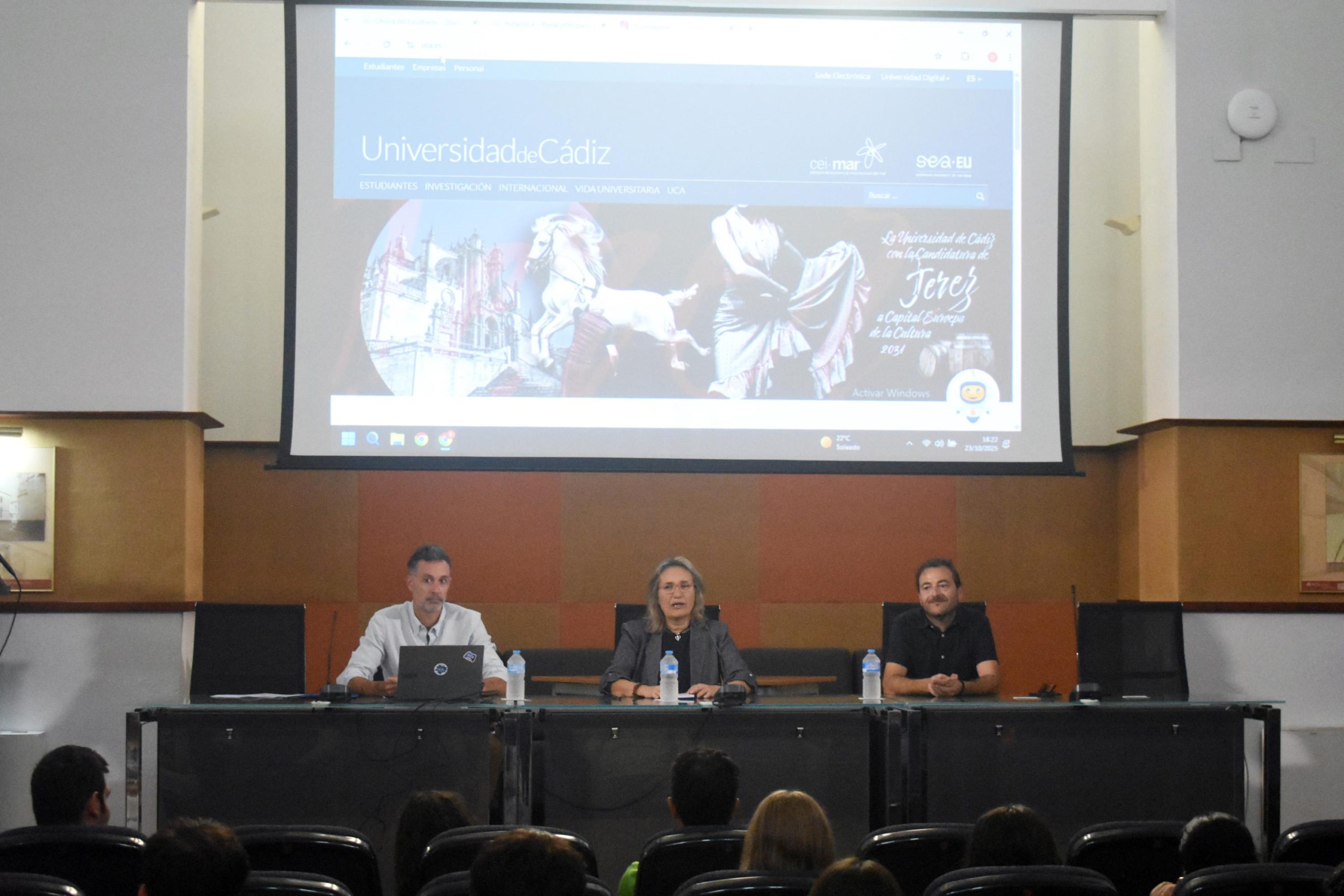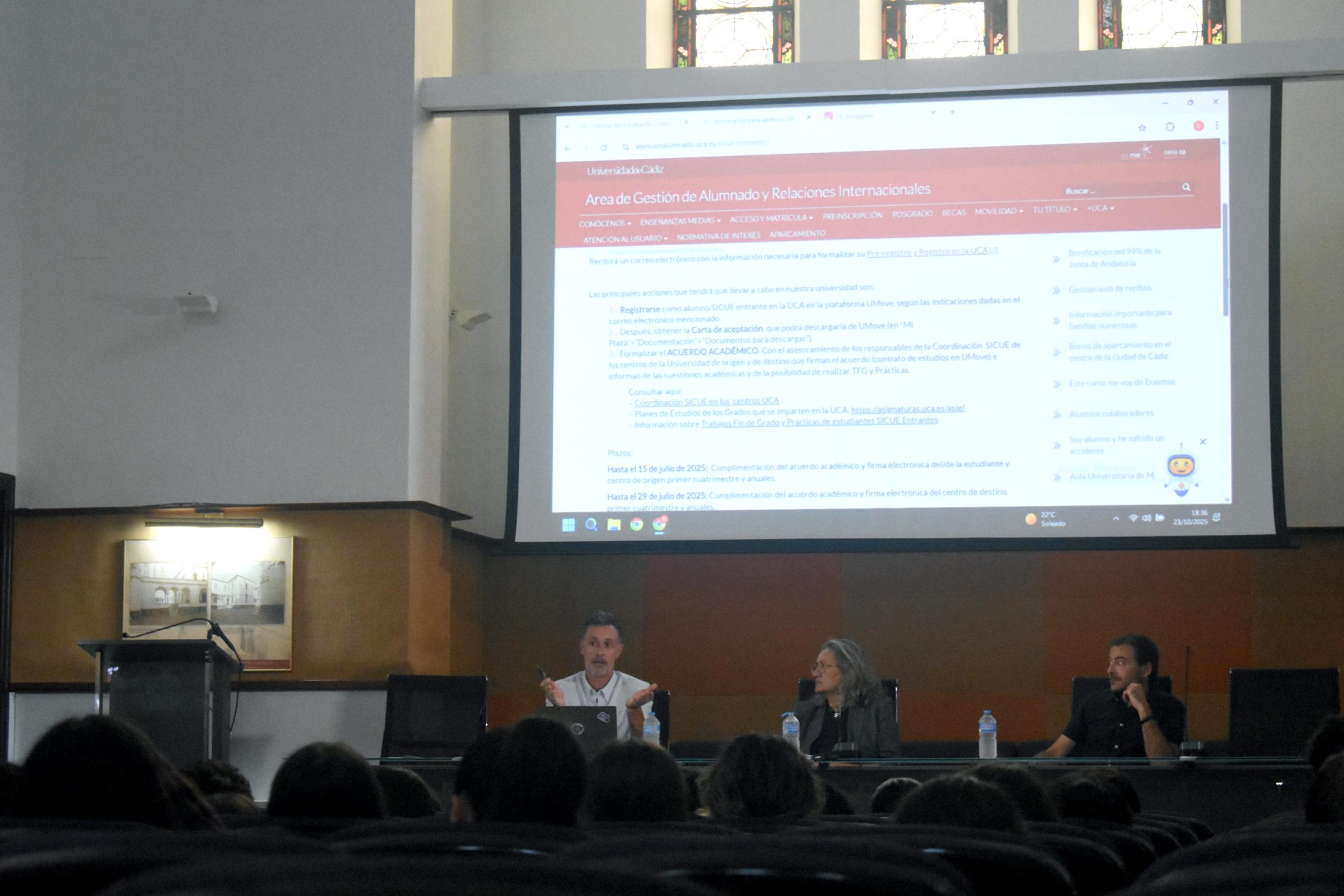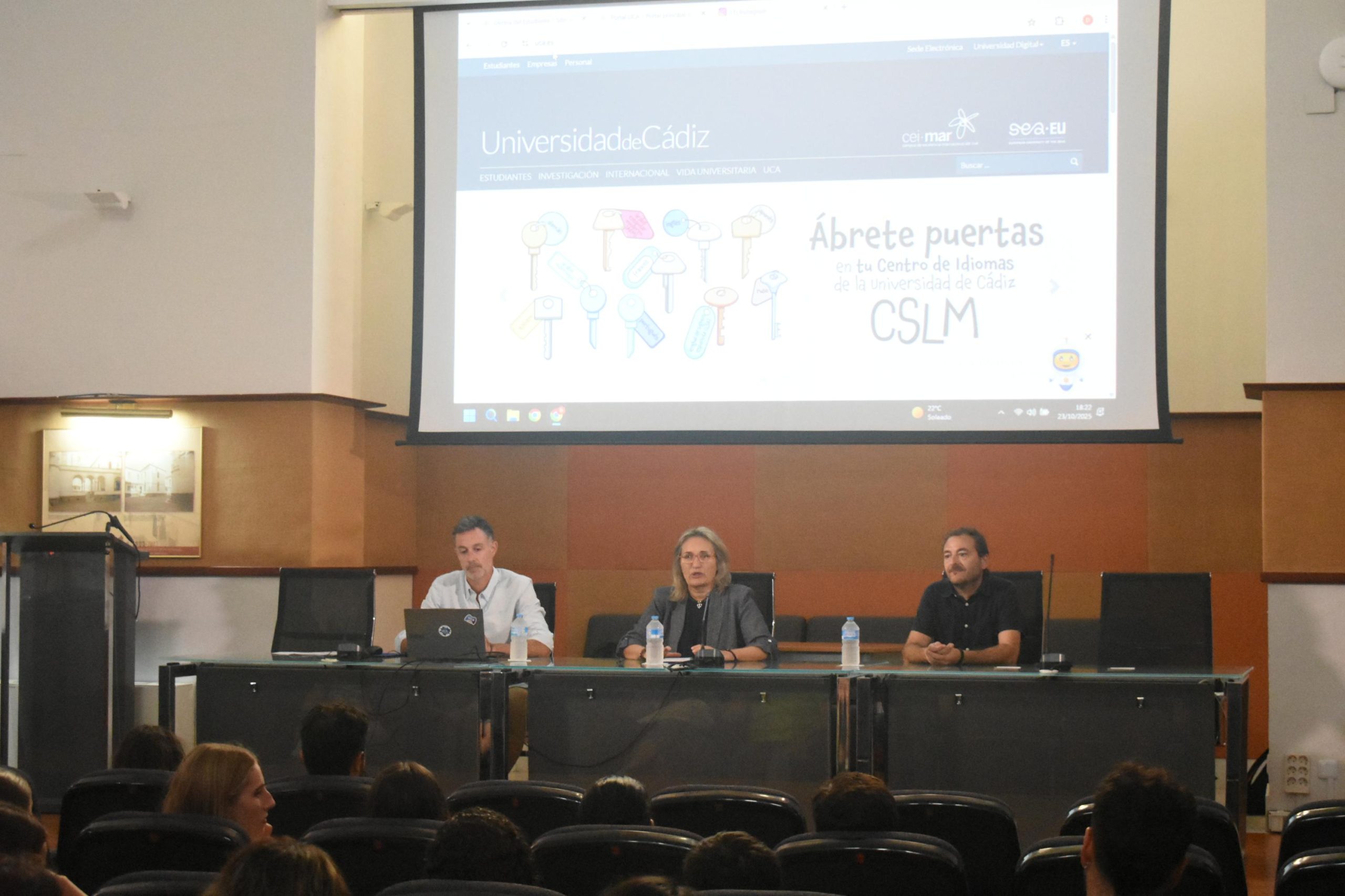 A continuación, ha tenido lugar la bienvenida oficial, presentada por Federico Hervías, director general de Alumnado y de la Oficina del Estudiante, quien ha dado a conocer el servicio de atención disponible “para que tengáis a vuestra disposición la opción de hacer consultas, tanto sobre cuestiones académicas como, incluso, personales durante vuestra estancia”. El estudiantado cuenta con oficinas de atención en los cuatro campus de la UCA: Cádiz, Puerto Real, Jerez y Bahía de Algeciras. Previamente, Miguel Ángel Aroca, técnico gestor del programa SICUE, ha explicado al alumnado entrante los aspectos más técnicos y administrativos que afectan a su estancia como estudiantes nacionales en la Universidad de Cádiz.