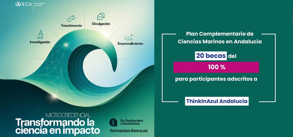 La Universidad de Cádiz, a través de los vicerrectorados de Investigación y Transferencia y Emprendimiento y Empleabilidad, junto con el Campus de Excelencia Internacional del Mar (CEI·MAR), ha creado la microcredencial ‘Transformando la Ciencia en Impacto Real’. De las 50 plazas ofertadas, 20 serán becadas por el Plan Complementario de Ciencias Marinas en Andalucía, ThinkInAzul Andalucía, cubriendo el 100% del coste a los participantes adscritos al Plan en la región.