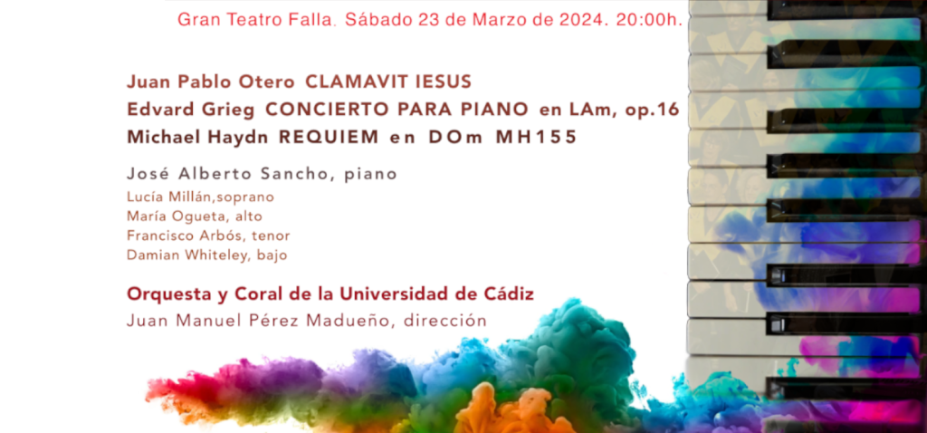 La Orquesta y la Coral de la Universidad de Cádiz celebran el próximo sábado, 23 de marzo, a las 20 horas y en el Gran Teatro Falla de Cádiz, un concierto extraordinario con motivo de la Semana Santa. En esta ocasión, los conjuntos interpretarán la Clamavit Iesus, de Juan Pablo Otero, el Concierto para Piano en LAm (op.16), de Edvard Grieg, y el Réquiem en Dom (MH 155), de Michael Haydn. Las formaciones de la UCA estarán acompañadas de la soprano Lucía Millán, María Ogueta (alto), el tenor Francisco Arbós, Damian Whiteley (bajo) y el pianista José Alberto Sancho, bajo la dirección musical de Juan Manuel Pérez Madueño.
