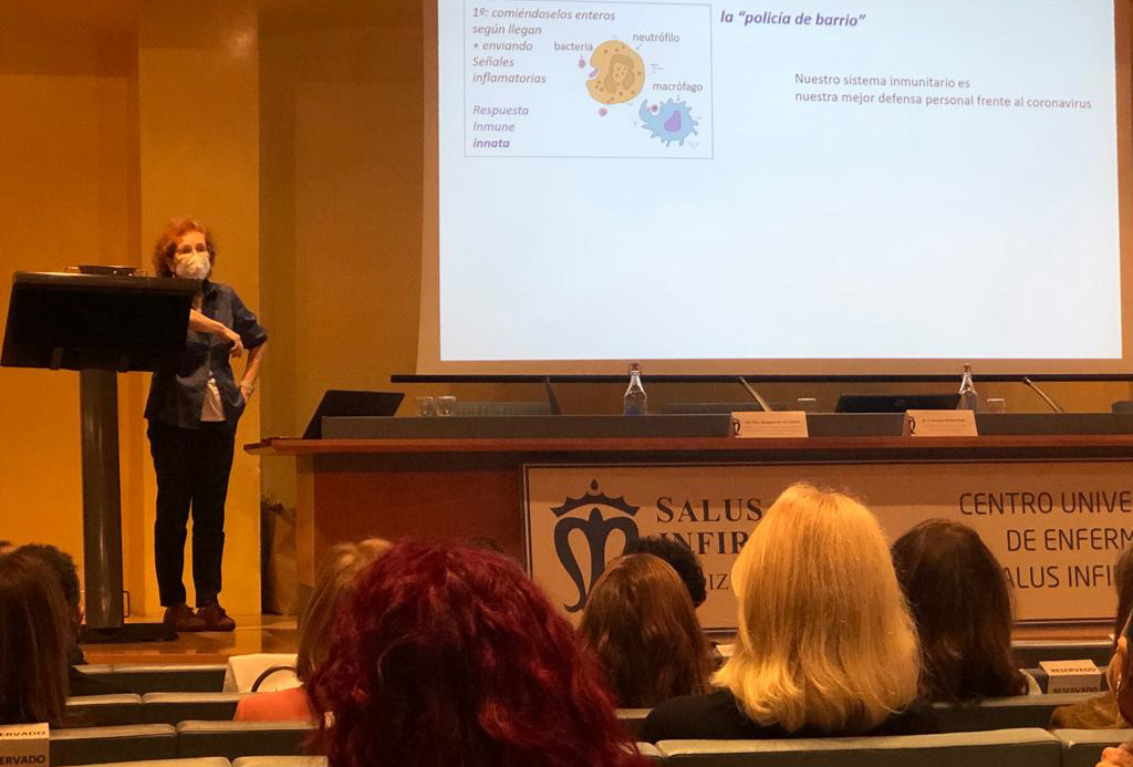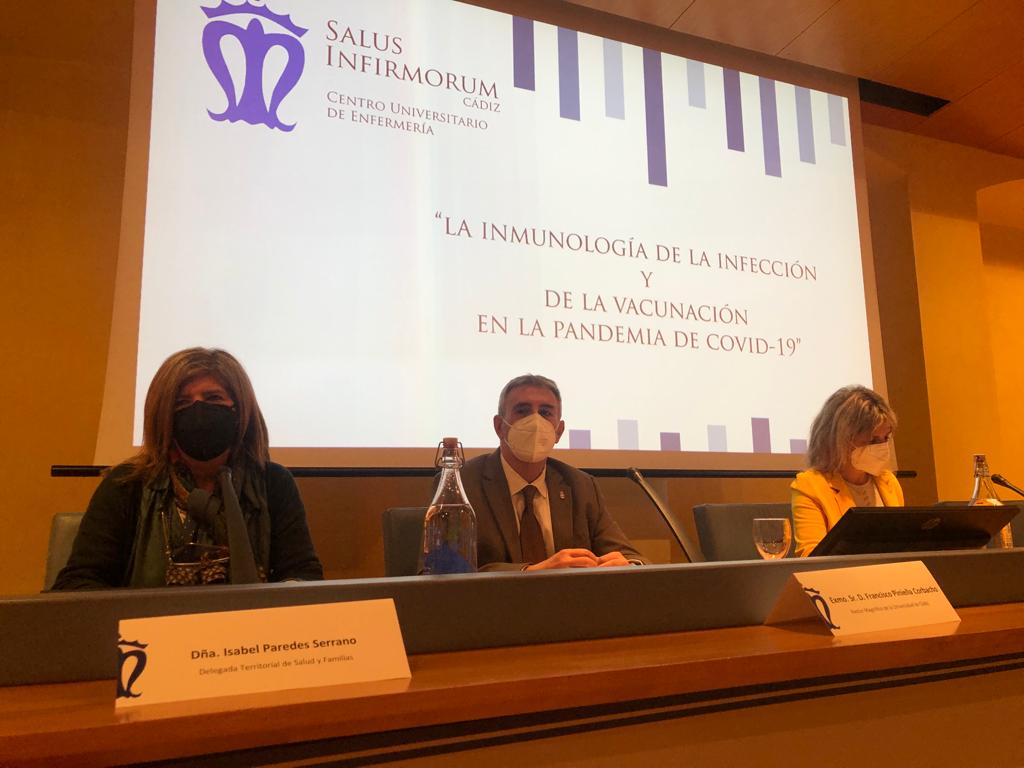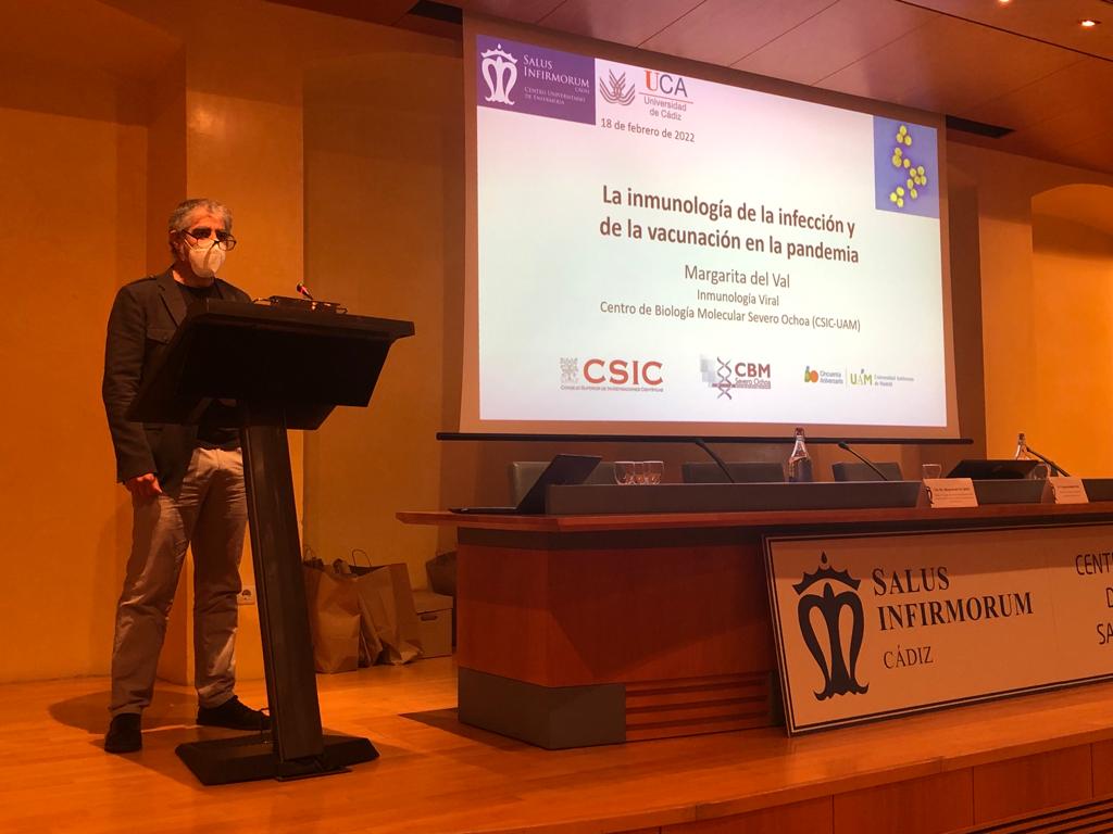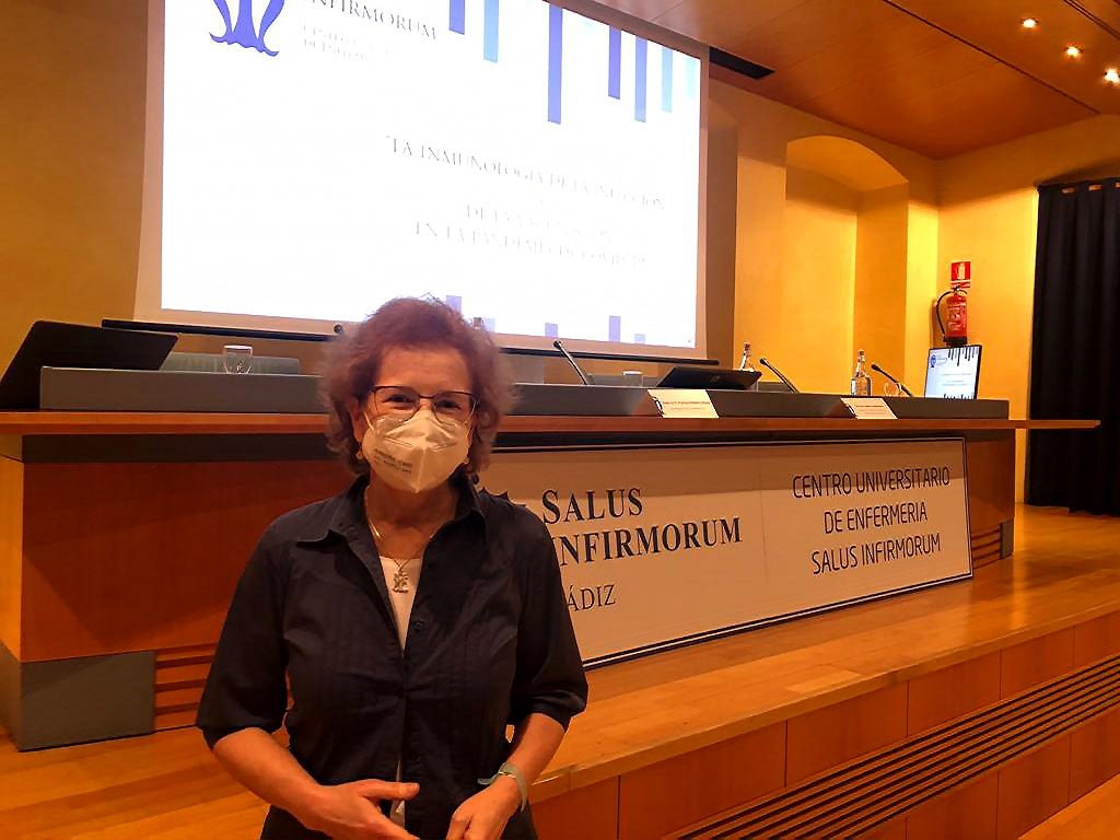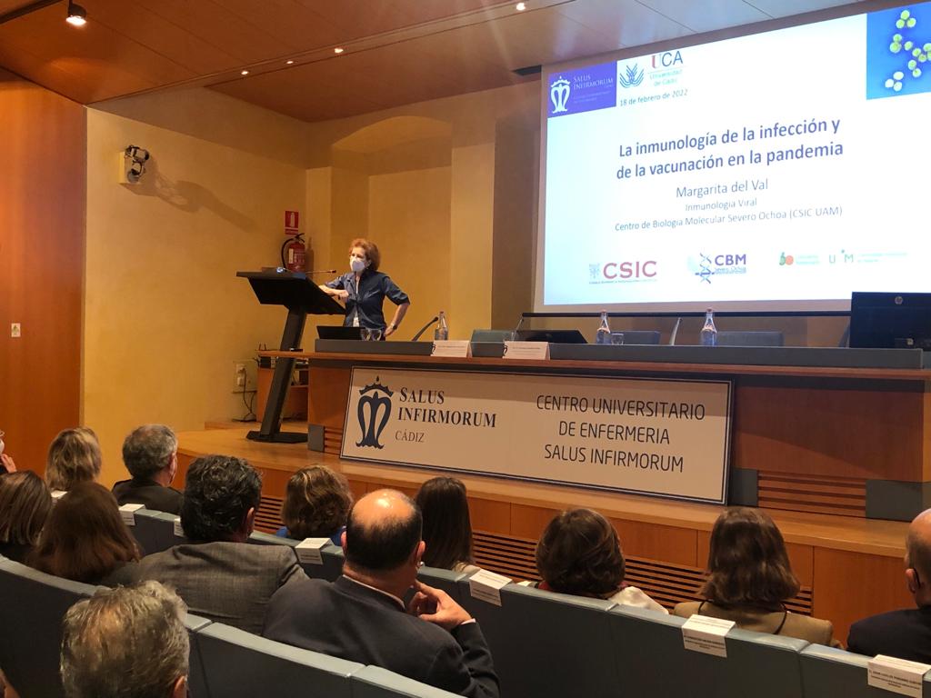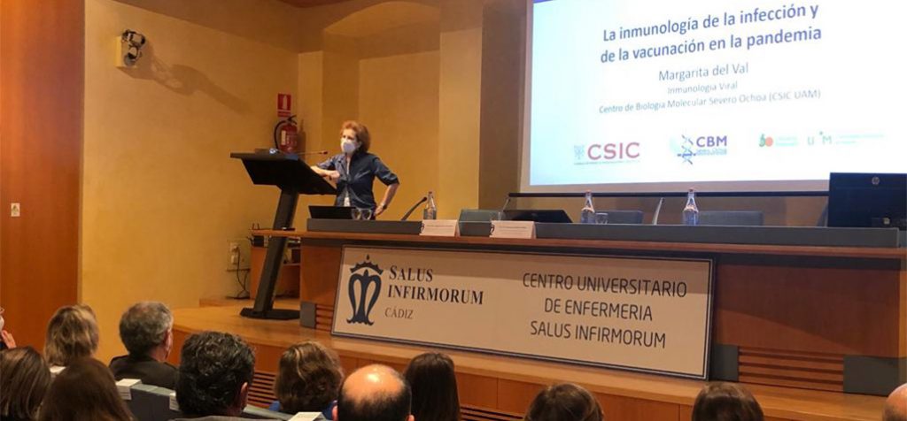 La viróloga e inmunóloga del Centro de Biología Molecular Severo Ochoa (CSIC-UAM) y coordinadora de la Plataforma de Investigación en Salud Global del CSIC, una de las voces más respetadas y consultadas durante esta pandemia en la divulgación científica con respecto a la COVID-19, Margarita del Val Latorre, ha impartido hoy la conferencia La Inmunología de la Infección y de la Vacunación en la Pandemia del COVID-19, en el Palacio de Congresos de Cádiz, en un encuentro, organizado por el Centro Universitario de Enfermería Salus Infirmorum adscrito a la Universidad de Cádiz, donde también se ha celebrado una mesa debate con expertos académicos y profesionales de la UCA y el Servicio Andaluz de Salud.