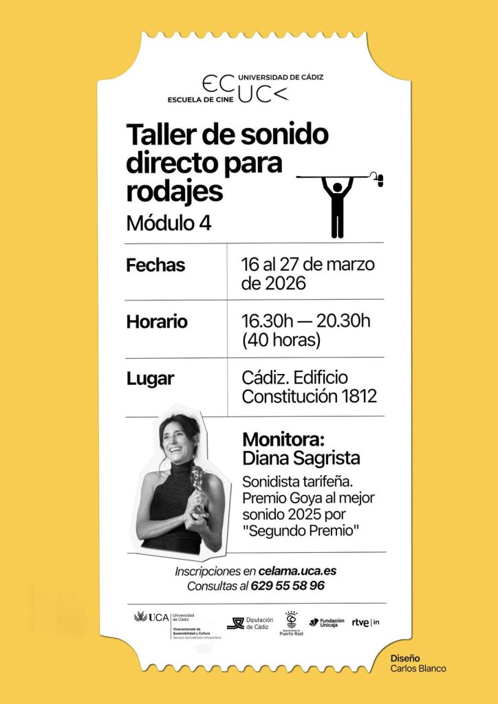 La Escuela de Cine de la Universidad de Cádiz, organizada por el Servicio de Extensión Universitaria del Vicerrectorado de Sostenibilidad y Cultura, amplía su oferta formativa con el Taller de sonido directo para rodajes, un nuevo módulo que será impartido por la reconocida sonidista Diana Sagrista. La actividad tendrá lugar en el Campus de Cádiz entre los días 16 y 27 de marzo de 2026, en horario de tarde, de 16.30 a 20.30 horas.