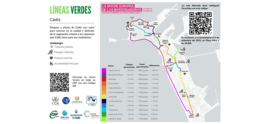 En el marco de la programación previa a la Noche Europea de los Investigadores 2021, la unidad de Cultura Científica y de la Innovación del Vicerrectorado de Política Científica y Tecnológica de la Universidad de Cádiz organiza hoy, jueves 9, a las 18,30 horas y en el parque Genovés, la presentación de las Líneas Verdes de Cádiz. Una iniciativa, que cuenta con la participación del Instituto Universitario de Investigación y Desarrollo Social Sostenible (INDESS), del Ayuntamiento de Cádiz, que ha prestado su apoyo institucional al proyecto (Delegación de Medio Ambiente) y la Asociación de Familiares, Allegados y personas con Enfermedad Mental (FAEM).