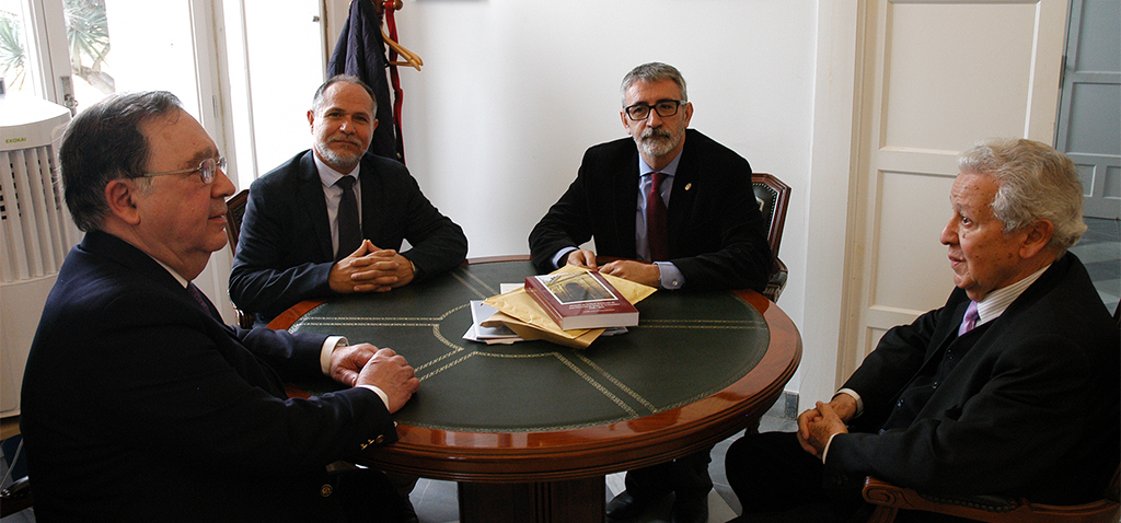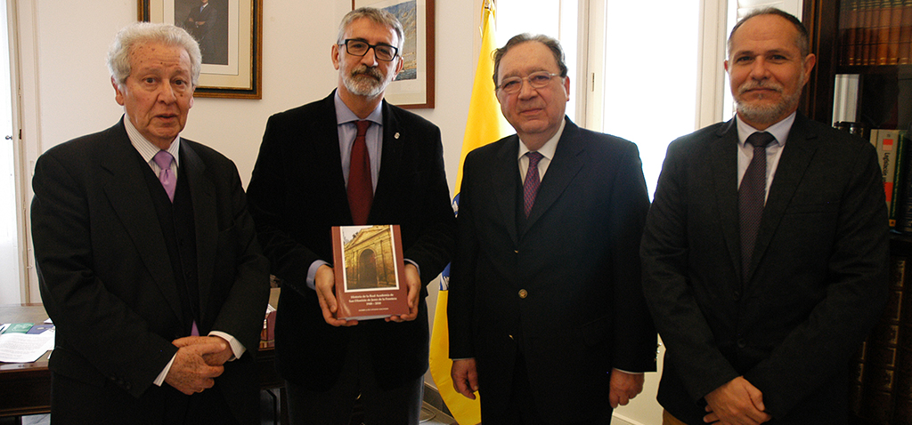 La Real Academia de San Dionisio de Ciencias, Artes y Letras ha entregado a la Universidad de Cádiz un ejemplar de la reciente obra publicada: Historia de la Real Academia de San Dionisio de Jerez de la Frontera 1948-2018. El rector de la Universidad de Cádiz, Francisco Piniella, en compañía del delegado del Rector para el Campus de Jerez, Antonio Rafael Peña, ha recibido en el Rectorado al presidente de la Real Academia de San Dionisio, Joaquín Ortiz, y al autor del libro, Andrés Luis Cañadas.