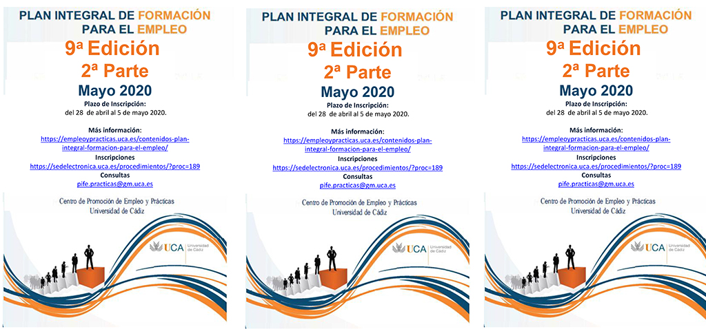El Centro de Promoción de Empleo y Prácticas de la Universidad de Cádiz convoca la segunda parte de la IX edición del Plan Integral de Formación para el Empleo (PIFE/Orientación Profesional), dirigido a su alumnado de los últimos cursos. El plazo para la presentación de solicitudes será desde hoy, martes 28 de abril, al 5 de mayo en https://sedelectronica.uca.es/procedimientos/?proc=189