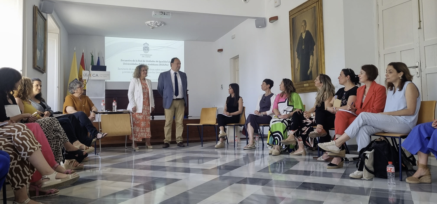 El rector de la Universidad de Cádiz, Casimiro Mantell, junto a la directora General de Igualdad de la UCA, Francisca Bernal, ha dado hoy la bienvenida a las 23 representantes de las unidades de Igualdad de las diez instituciones universitarias públicas de Andalucía que participan esta semana en Cádiz del Encuentro de la Red de Unidades de Igualdad de las Universidades Públicas Andaluzas (RUIUPA), cuyo programa incluye, entre otras actividades, un seminario de experiencias prácticas sobre acoso sexual y acoso por razón de género en las universidades.