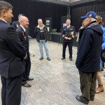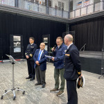 El comandante del JS Elcano, Manuel García, acompañado por el comandante Naval de Cádiz, Miguel Ángel Díaz Jiménez, y el director de secretariado de Acción Cultural y Deportes de la UCA, Román Nuviala, han presidido el acto inaugural, en el hall del centro.