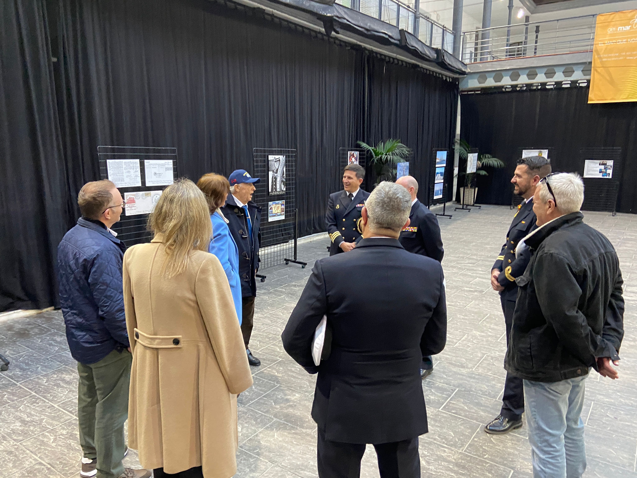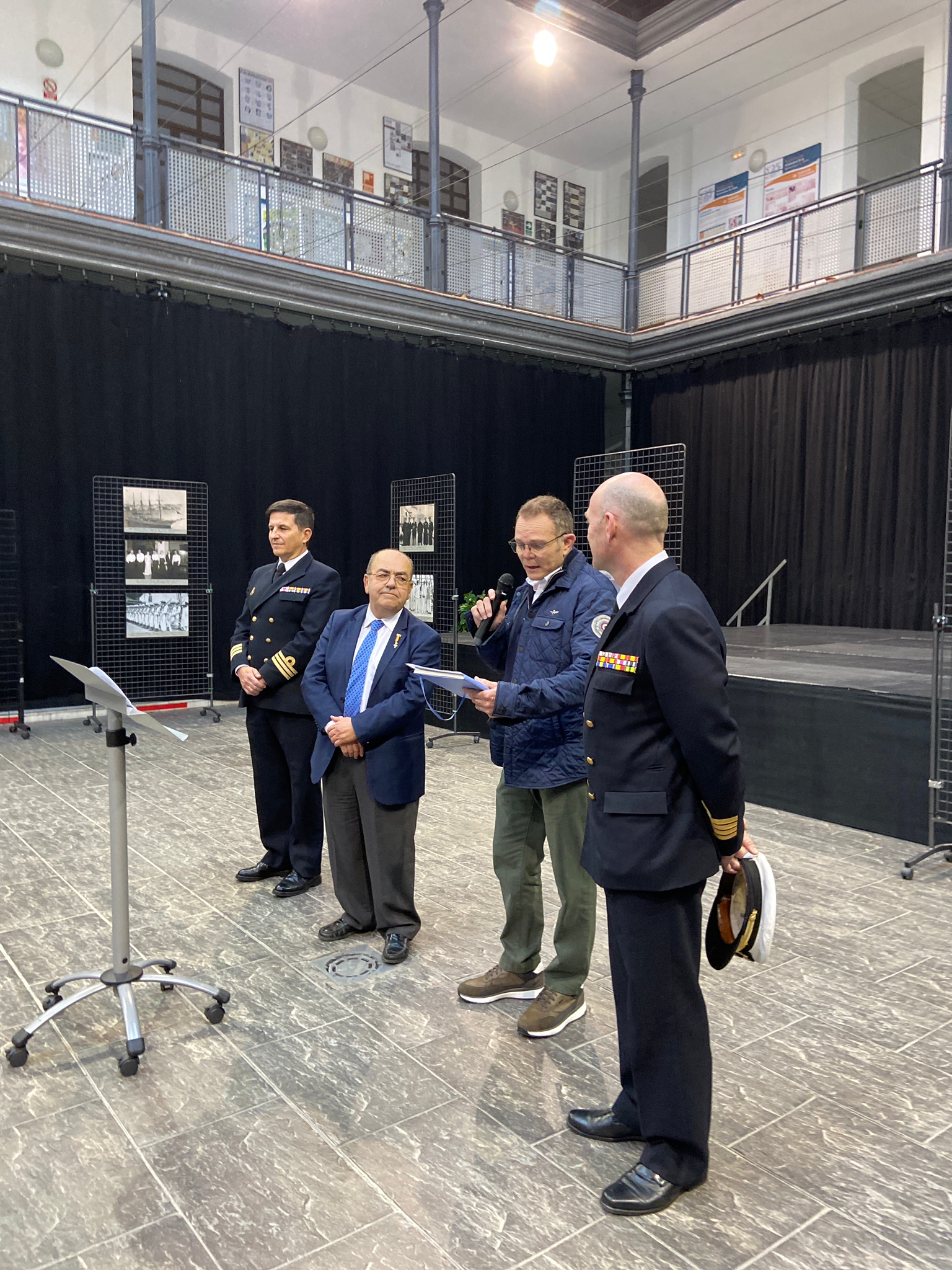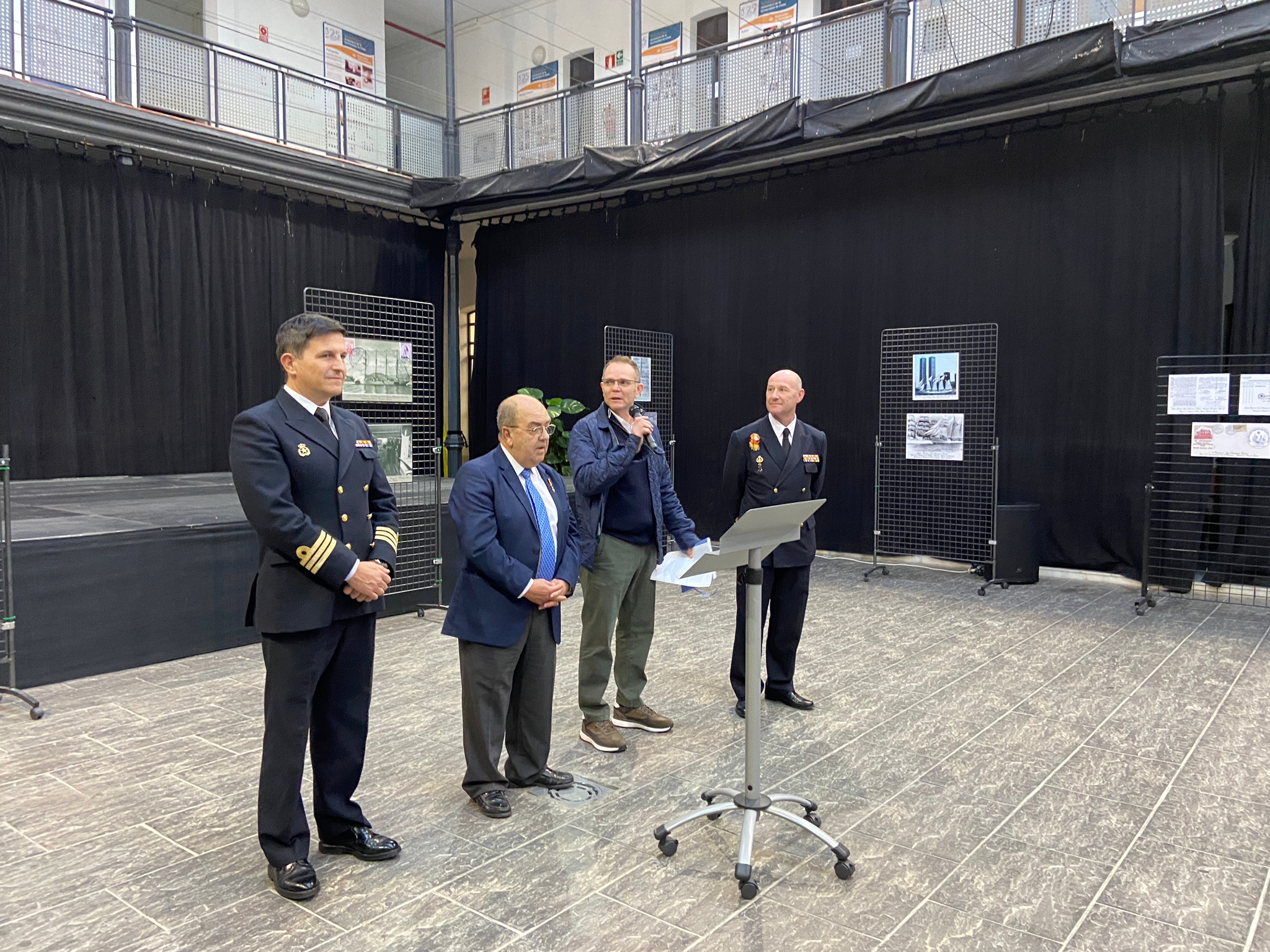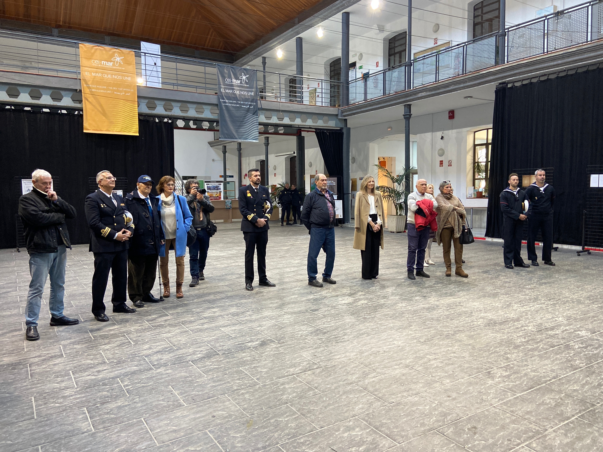 El comandante del JS Elcano, Manuel García, acompañado por el comandante Naval de Cádiz, Miguel Ángel Díaz Jiménez, y el director de secretariado de Acción Cultural y Deportes de la UCA, Román Nuviala, han presidido el acto inaugural, en el hall del centro.