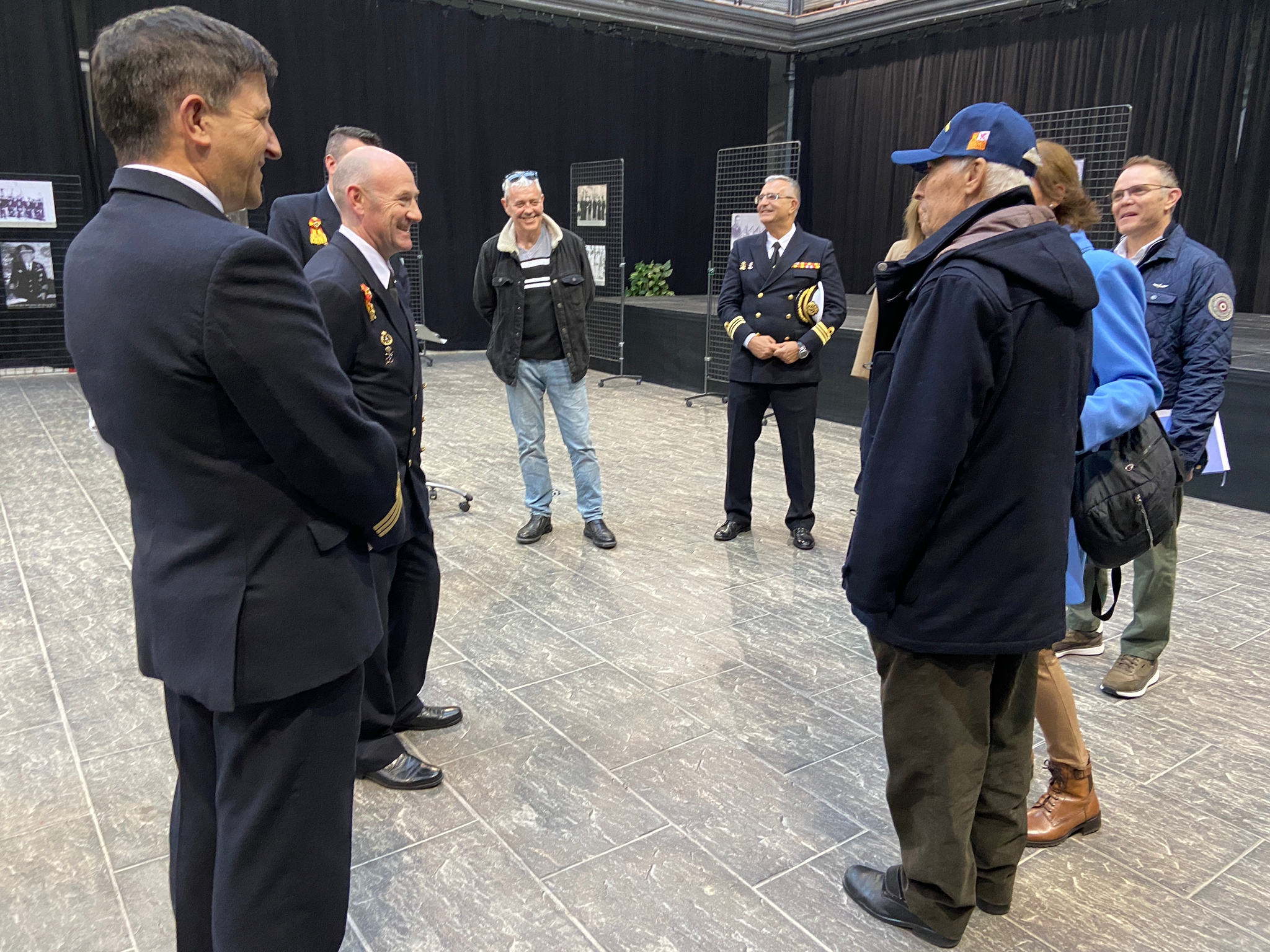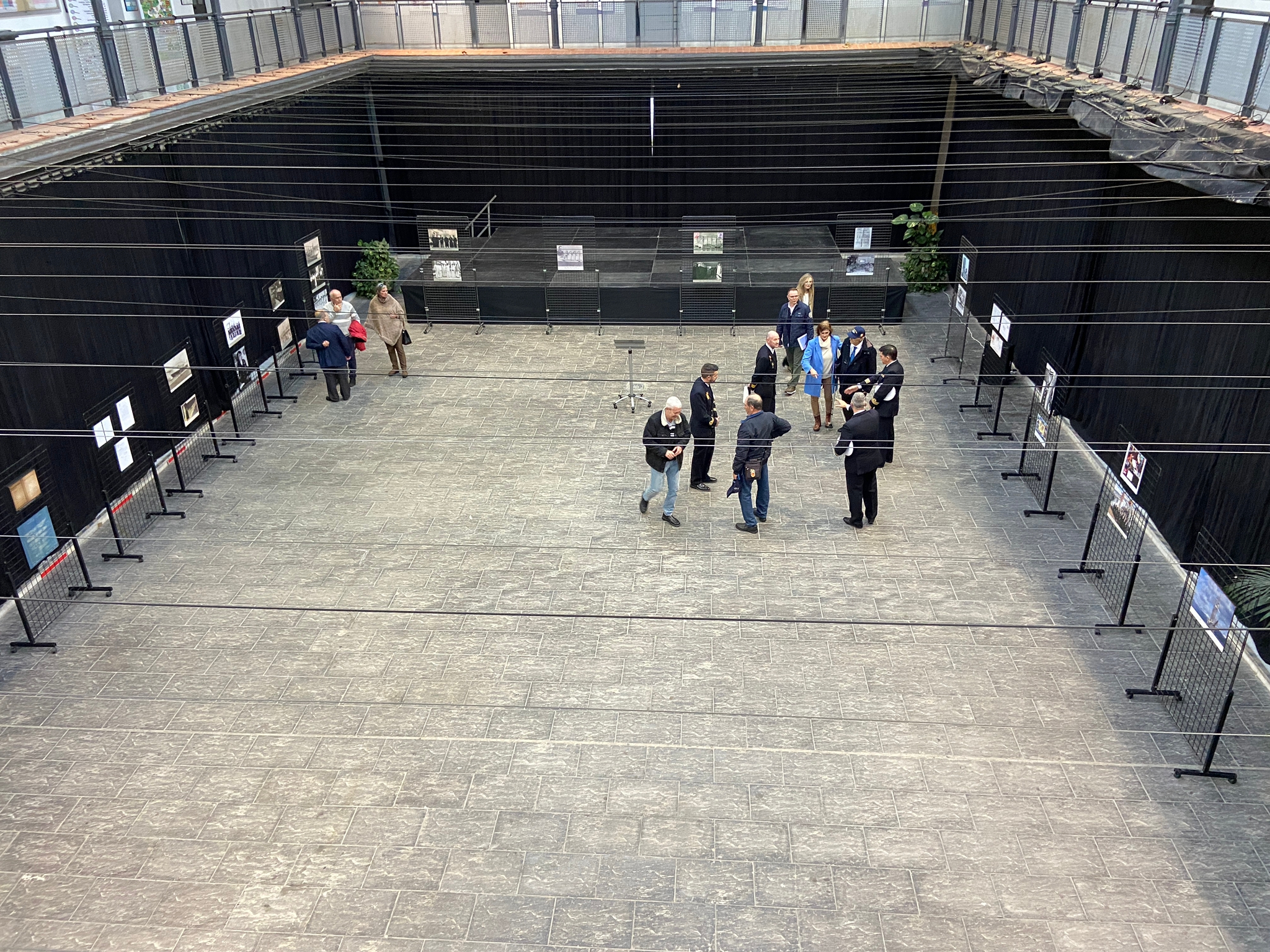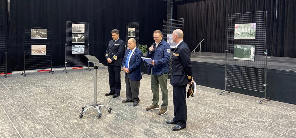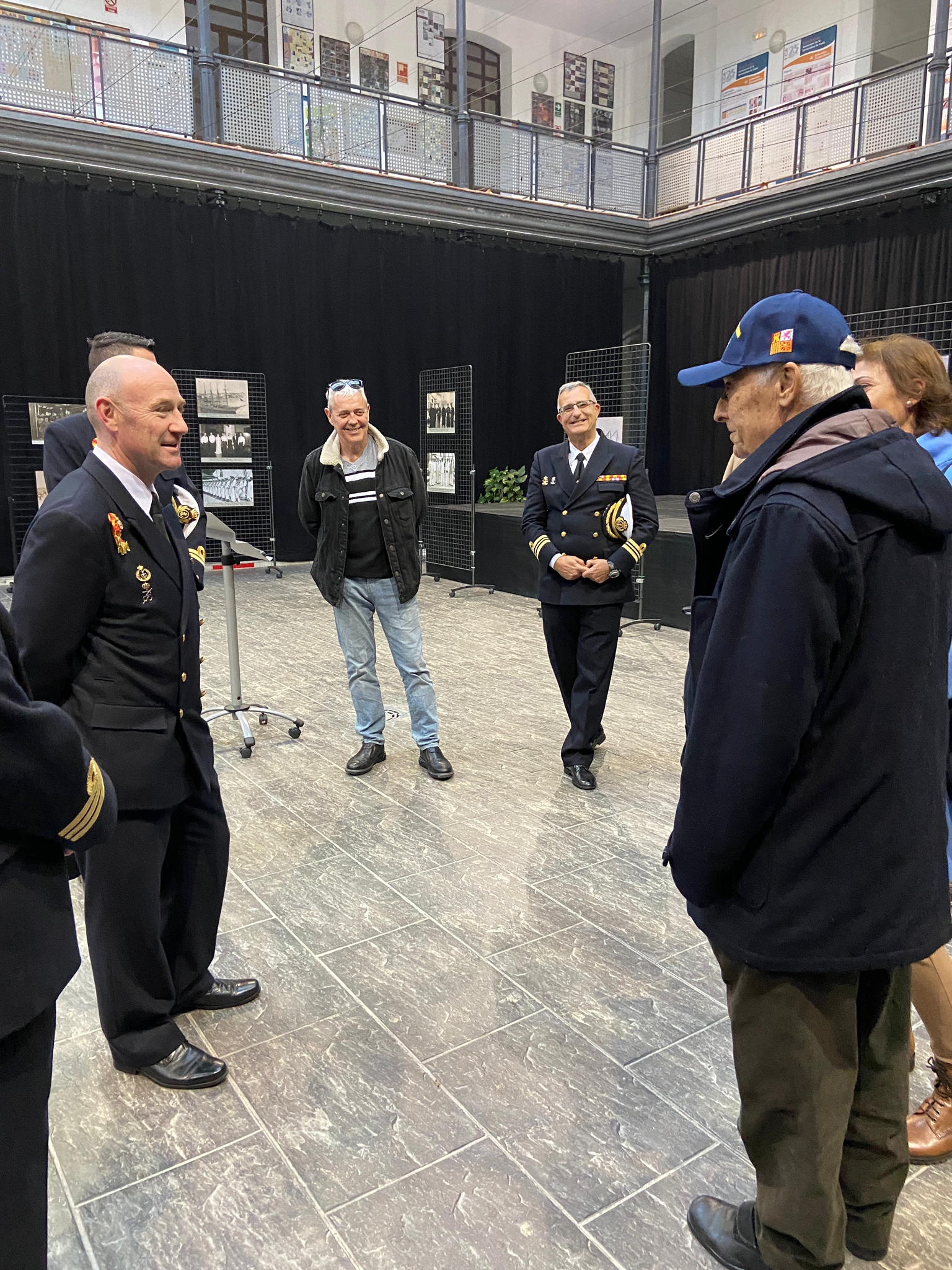 El comandante del JS Elcano, Manuel García, acompañado por el comandante Naval de Cádiz, Miguel Ángel Díaz Jiménez, y el director de secretariado de Acción Cultural y Deportes de la UCA, Román Nuviala, han presidido el acto inaugural, en el hall del centro.