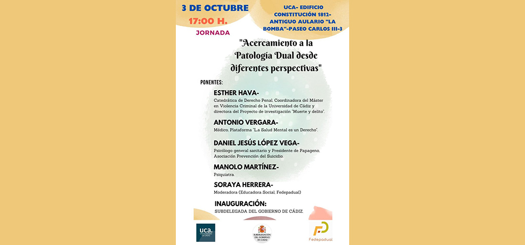 La Federación Nacional de Patología Dual celebra el próximo jueves 3, a las 17 horas, una jornada sobre ‘Acercamiento a la Patología Dual desde diferentes perspectivas’ en la sala Argüelles del edificio Constitución 1812. Se enmarca en el ciclo ‘Miradas con Lupa’ de la oficina de Acción Social y Solidaria del Vicerrectorado de Sostenibilidad y Cultura de la Universidad de Cádiz. El acto inaugural contará con la presencia de la subdelegada del Gobierno de Cádiz, Blanca Flores.